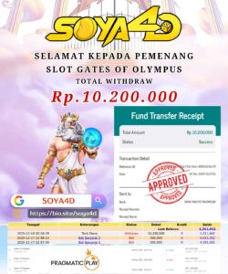 Selamat kepada Userid : Iya**** Telah berhasil mendapatkan kemenangan besar pada permainan SLOT GATES OF OLYMPUS . Dengan kemenangan Sebesar Rp.10.200.000.-. Setelah mengisi formulir withdraw dengan kurang waktu hanya 1 – 10 menit pihak SOYA4D  sudah melakukan transfer kepada pemilik user id. Dan dana sudah masuk ke rekening id tersebut oleh pemenang. Bukti pembayaran yang kami berikan merupakan bukti pembayaran yang SAH / VALID yang langsung di dapatkan melalui tanda transfer transaksi berhasil dari Bank yang di tuju.