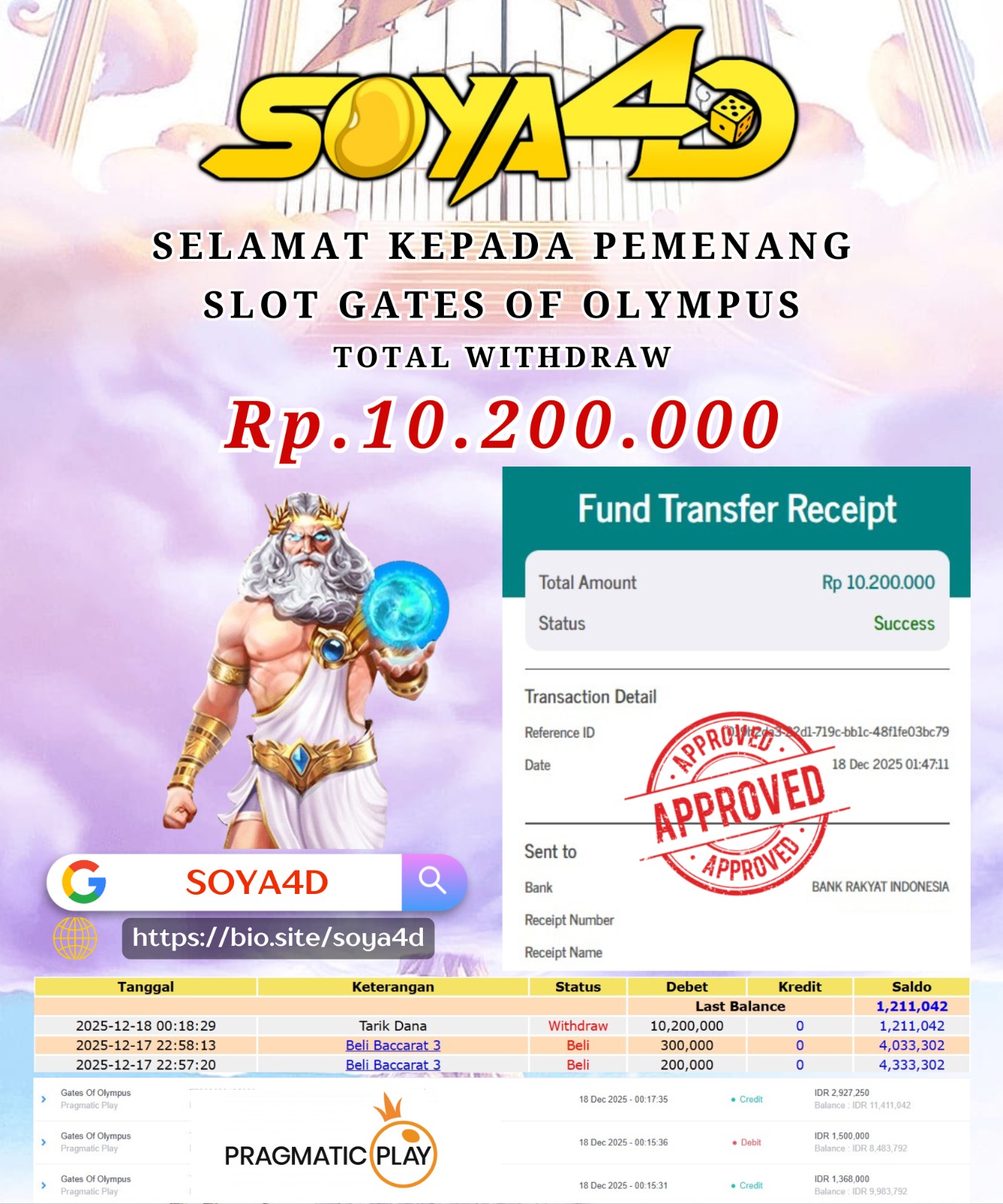 Selamat kepada Userid : Iya**** Telah berhasil mendapatkan kemenangan besar pada permainan SLOT GATES OF OLYMPUS . Dengan kemenangan Sebesar Rp.10.200.000.-. Setelah mengisi formulir withdraw dengan kurang waktu hanya 1 – 10 menit pihak SOYA4D  sudah melakukan transfer kepada pemilik user id. Dan dana sudah masuk ke rekening id tersebut oleh pemenang. Bukti pembayaran yang kami berikan merupakan bukti pembayaran yang SAH / VALID yang langsung di dapatkan melalui tanda transfer transaksi berhasil dari Bank yang di tuju.