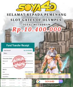 Selamat kepada Userid : Sat***** Telah berhasil mendapatkan kemenangan besar pada permainan SLOT GATES OF OLYMPUS . Dengan kemenangan Sebesar Rp. 10.400.000.-. Setelah mengisi formulir withdraw dengan kurang waktu hanya 1 – 10 menit pihak SOYA4D sudah melakukan transfer kepada pemilik user id. Dan dana sudah masuk ke rekening id tersebut oleh pemenang. Bukti pembayaran yang kami berikan merupakan bukti pembayaran yang SAH / VALID yang langsung di dapatkan melalui tanda transfer transaksi berhasil dari Bank yang di tuju.