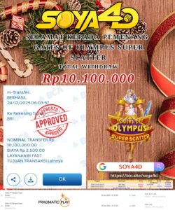 Selamat kepada Userid : Udi***** Telah berhasil mendapatkan kemenangan besar pada permainan SLOT GATES OF OLYMPUS SUPER SCATTER. Dengan kemenangan Sebesar Rp. 10.100.000.-. Setelah mengisi formulir withdraw dengan kurang waktu hanya 1 – 10 menit pihak SOYA4D  sudah melakukan transfer kepada pemilik user id. Dan dana sudah masuk ke rekening id tersebut oleh pemenang. Bukti pembayaran yang kami berikan merupakan bukti pembayaran yang SAH / VALID yang langsung di dapatkan melalui tanda transfer transaksi berhasil dari Bank yang di tuju.