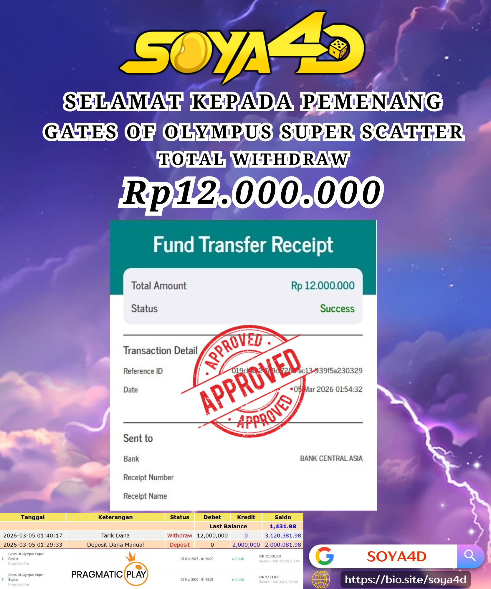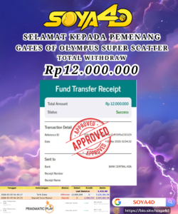 Selamat kepada Userid : KAG***** Telah berhasil mendapatkan kemenangan besar pada permainan SLOT GATES OF OLYMPUS SUPER SCATTER . Dengan kemenangan Sebesar Rp. 12.000.000.-. Setelah mengisi formulir withdraw dengan kurang waktu hanya 1 – 10 menit pihak SOYA4D sudah melakukan transfer kepada pemilik user id. Dan dana sudah masuk ke rekening id tersebut oleh pemenang. Bukti pembayaran yang kami berikan merupakan bukti pembayaran yang SAH / VALID yang langsung di dapatkan melalui tanda transfer transaksi berhasil dari Bank yang di tuju. Kami juga mengucapakan banyak Terima Kasih Kepada pemenang karena sudah mempercayakan kami sebagai Bandar Tepercaya yang membayar semua kemenangan member hingga lunas.