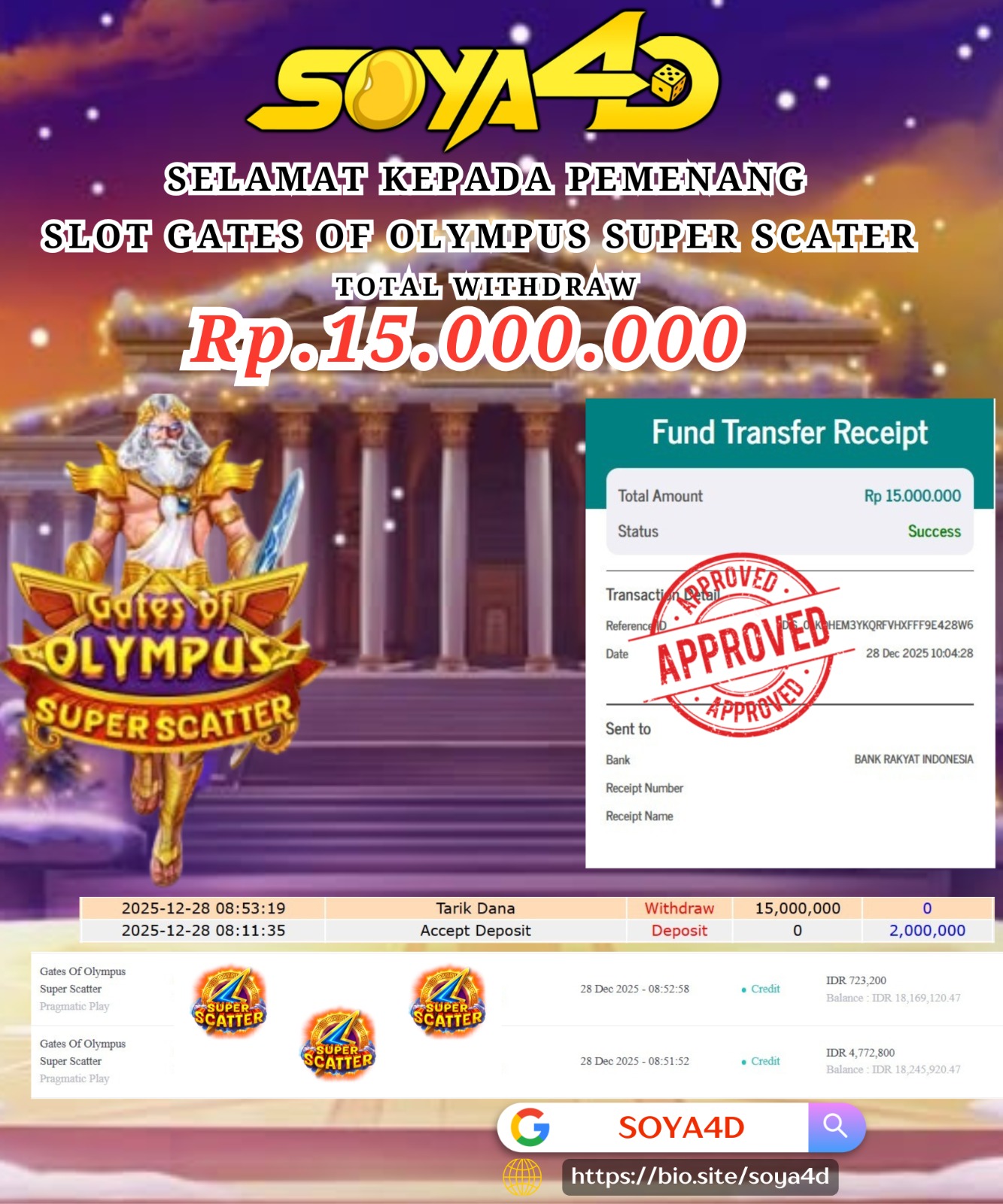 Selamat kepada Userid : Loe***** Telah berhasil mendapatkan kemenangan besar pada permainan SLOT GATES OF GATOT KACA SUPER SCATTER . Dengan kemenangan Sebesar Rp. 15.000.000.-. Setelah mengisi formulir withdraw dengan kurang waktu hanya 1 – 10 menit pihak SOYA4D sudah melakukan transfer kepada pemilik user id. Dan dana sudah masuk ke rekening id tersebut oleh pemenang. Bukti pembayaran yang kami berikan merupakan bukti pembayaran yang SAH / VALID yang langsung di dapatkan melalui tanda transfer transaksi berhasil dari Bank yang di tuju.