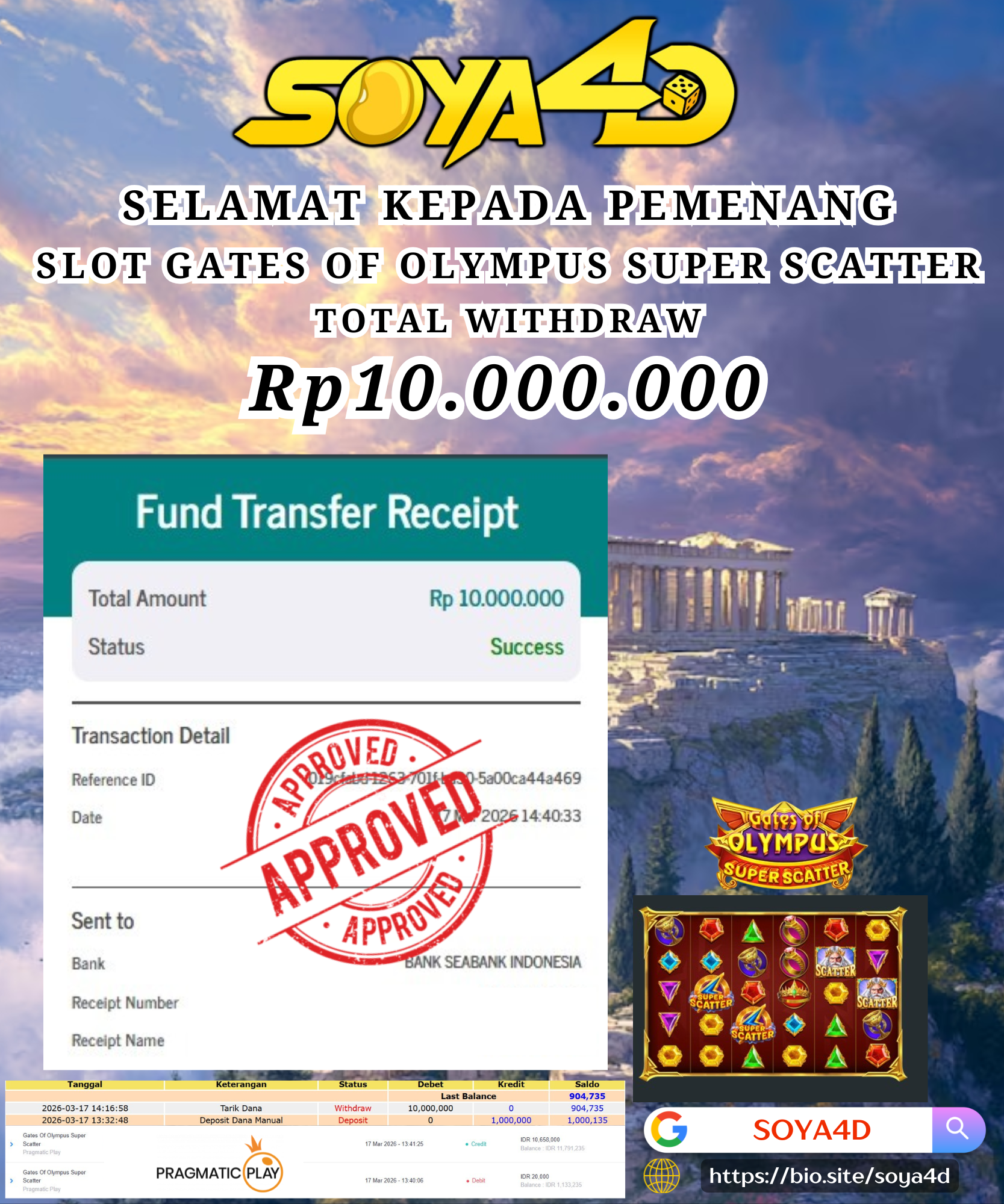 Selamat kepada Userid : CLI***** Telah berhasil mendapatkan kemenangan besar pada permainan SLOT GATES OF OLYMPUS SUPER SCATTER . Dengan kemenangan Sebesar Rp.  10.000.000.-. Setelah mengisi formulir withdraw dengan kurang waktu hanya 1 – 10 menit pihak SOYA4D  sudah melakukan transfer kepada pemilik user id. Dan dana sudah masuk ke rekening id tersebut oleh pemenang. Bukti pembayaran yang kami berikan merupakan bukti pembayaran yang SAH / VALID yang langsung di dapatkan melalui tanda transfer transaksi berhasil dari Bank yang di tuju. Kami juga mengucapakan banyak Terima Kasih Kepada pemenang karena sudah mempercayakan kami sebagai Bandar Tepercaya yang membayar semua kemenangan member hingga lunas.