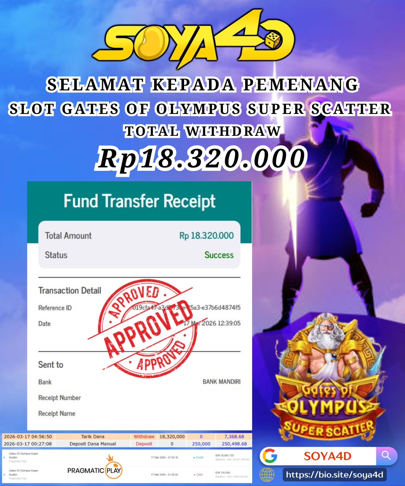 Selamat kepada Userid : Nma***** Telah berhasil mendapatkan kemenangan besar pada permainan SLOT GATES OF OLYMPUS SUPER SCATTER . Dengan kemenangan Sebesar Rp. 18.320.000.-. Setelah mengisi formulir withdraw dengan kurang waktu hanya 1 – 10 menit pihak SOYA4D sudah melakukan transfer kepada pemilik user id. Dan dana sudah masuk ke rekening id tersebut oleh pemenang. Bukti pembayaran yang kami berikan merupakan bukti pembayaran yang SAH / VALID yang langsung di dapatkan melalui tanda transfer transaksi berhasil dari Bank yang di tuju. Kami juga mengucapakan banyak Terima Kasih Kepada pemenang karena sudah mempercayakan kami sebagai Bandar Tepercaya yang membayar semua kemenangan member hingga lunas.