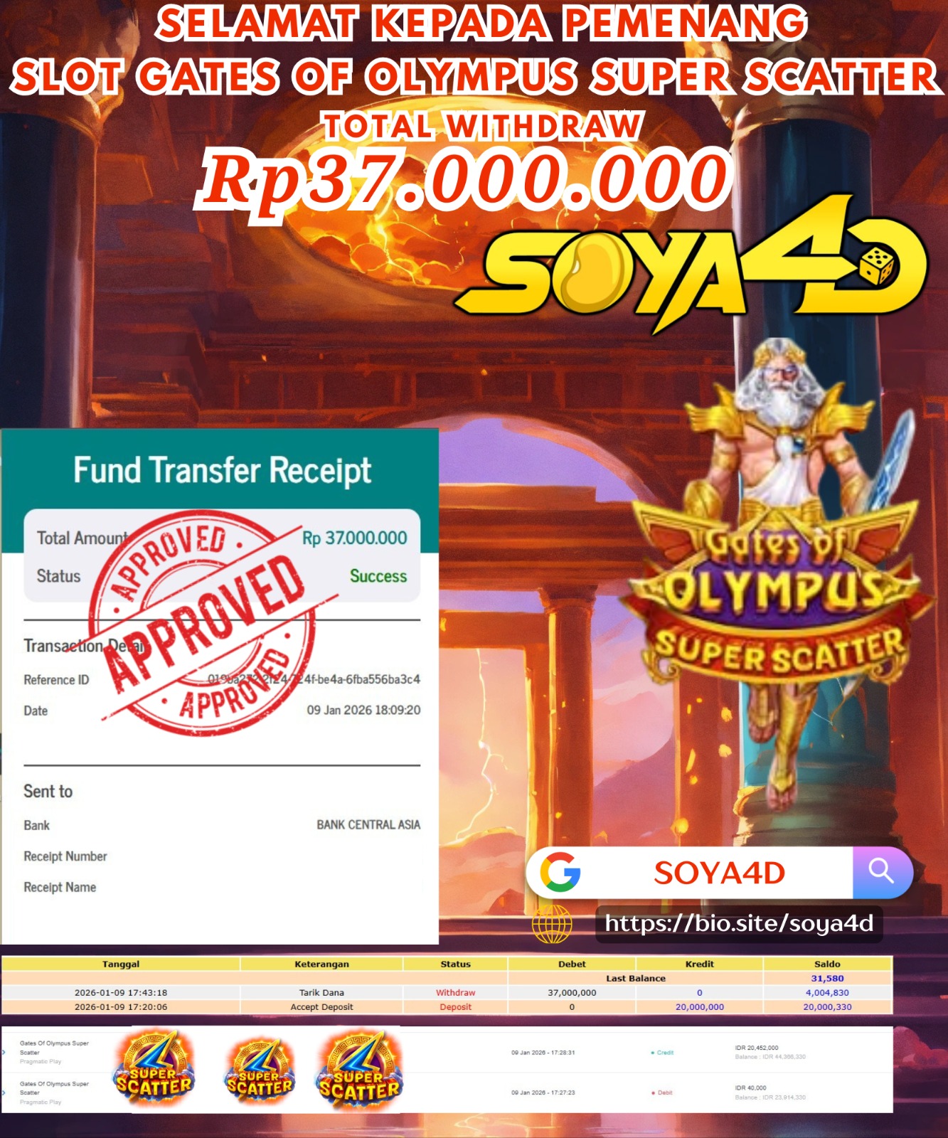 Selamat kepada Userid : Sin*** Telah berhasil mendapatkan kemenangan besar pada permainan SLOT GATES OF OLYMPUS SUPER SCATTER. Dengan kemenangan Sebesar Rp. 37.000.000.-. Setelah mengisi formulir withdraw dengan kurang waktu hanya 1 – 10 menit pihak SOYA4D sudah melakukan transfer kepada pemilik user id. Dan dana sudah masuk ke rekening id tersebut oleh pemenang. Bukti pembayaran yang kami berikan merupakan bukti pembayaran yang SAH / VALID yang langsung di dapatkan melalui tanda transfer transaksi berhasil dari Bank yang di tuju. Kami juga mengucapakan banyak Terima Kasih Kepada pemenang karena sudah mempercayakan kami sebagai Bandar Tepercaya yang membayar semua kemenangan member hingga lunas.