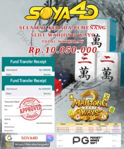 Selamat kepada Userid : Bea**** Telah berhasil mendapatkan kemenangan besar pada permainan SLOT MAHJONG WAYS . Dengan kemenangan Sebesar Rp.10.050.000.-. Setelah mengisi formulir withdraw dengan kurang waktu hanya 1 – 10 menit pihak SOYA4D sudah melakukan transfer kepada pemilik user id. Dan dana sudah masuk ke rekening id tersebut oleh pemenang. Bukti pembayaran yang kami berikan merupakan bukti pembayaran yang SAH / VALID yang langsung di dapatkan melalui tanda transfer transaksi berhasil dari Bank yang di tuju.