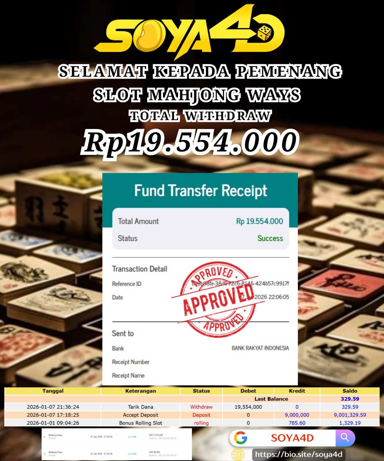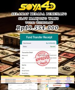 Selamat kepada Userid : Sam***** Telah berhasil mendapatkan kemenangan besar pada permainan SLOT MAHJONG WAYS . Dengan kemenangan Sebesar Rp. 19.554.000.-. Setelah mengisi formulir withdraw dengan kurang waktu hanya 1 – 10 menit pihak SOYA4D sudah melakukan transfer kepada pemilik user id. Dan dana sudah masuk ke rekening id tersebut oleh pemenang. Bukti pembayaran yang kami berikan merupakan bukti pembayaran yang SAH / VALID yang langsung di dapatkan melalui tanda transfer transaksi berhasil dari Bank yang di tuju. Kami juga mengucapakan banyak Terima Kasih Kepada pemenang karena sudah mempercayakan kami sebagai Bandar Tepercaya yang membayar semua kemenangan member hingga lunas.