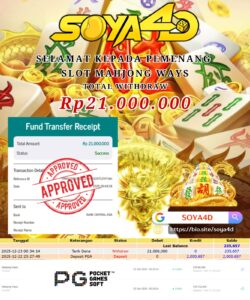 Selamat kepada Userid : Pol**** Telah berhasil mendapatkan kemenangan besar pada permainan SLOT MAHJONG WAYS . Dengan kemenangan Sebesar Rp. 21.000.000.-. Setelah mengisi formulir withdraw dengan kurang waktu hanya 1 – 10 menit pihak SOYA4D  sudah melakukan transfer kepada pemilik user id. Dan dana sudah masuk ke rekening id tersebut oleh pemenang. Bukti pembayaran yang kami berikan merupakan bukti pembayaran yang SAH / VALID yang langsung di dapatkan melalui tanda transfer transaksi berhasil dari Bank yang di tuju.