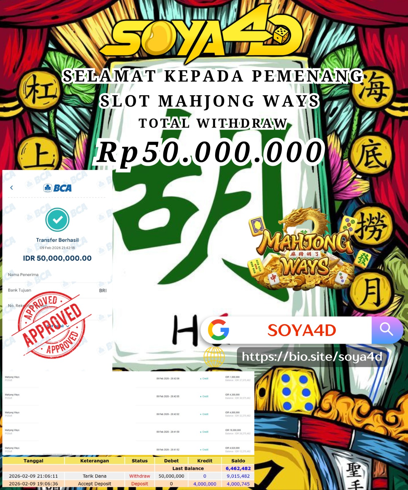 Selamat kepada Userid : Ela***** Telah berhasil mendapatkan kemenangan besar pada permainan SLOT MAHJONG WAYS. Dengan kemenangan Sebesar Rp. 50.000.000.-. Setelah mengisi formulir withdraw dengan kurang waktu hanya 1 – 10 menit pihak SOYA4D sudah melakukan transfer kepada pemilik user id. Dan dana sudah masuk ke rekening id tersebut oleh pemenang. Bukti pembayaran yang kami berikan merupakan bukti pembayaran yang SAH / VALID yang langsung di dapatkan melalui tanda transfer transaksi berhasil dari Bank yang di tuju. Kami juga mengucapakan banyak Terima Kasih Kepada pemenang karena sudah mempercayakan kami sebagai Bandar Tepercaya yang membayar semua kemenangan member hingga lunas.