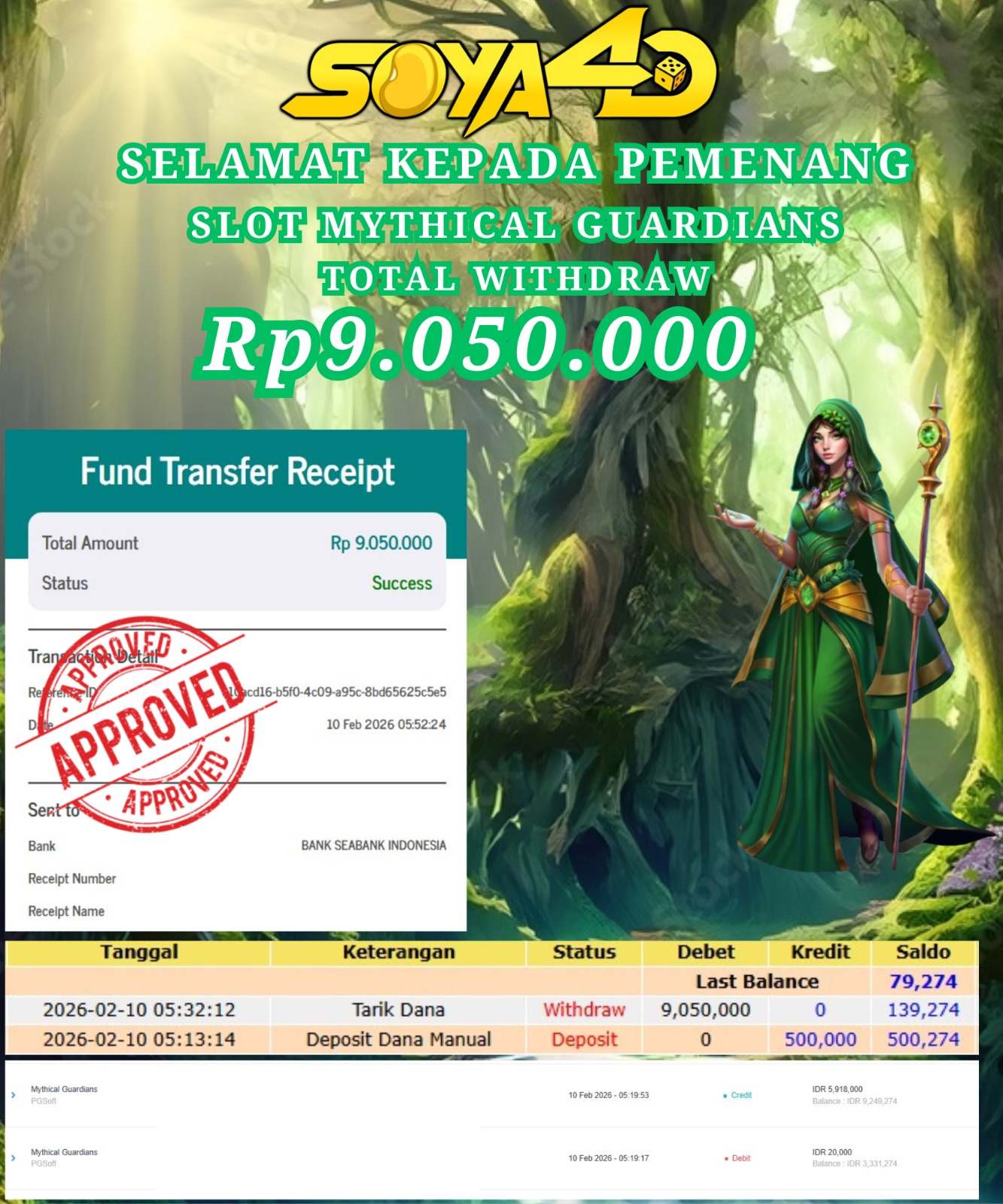 Selamat kepada Userid : Ham*** Telah berhasil mendapatkan kemenangan besar pada permainan SLOT MYTHICAL GUARDIANS. Dengan kemenangan Sebesar Rp. 9.050.000.-. Setelah mengisi formulir withdraw dengan kurang waktu hanya 1 – 10 menit pihak SOYA4D sudah melakukan transfer kepada pemilik user id. Dan dana sudah masuk ke rekening id tersebut oleh pemenang. Bukti pembayaran yang kami berikan merupakan bukti pembayaran yang SAH / VALID yang langsung di dapatkan melalui tanda transfer transaksi berhasil dari Bank yang di tuju. Kami juga mengucapakan banyak Terima Kasih Kepada pemenang karena sudah mempercayakan kami sebagai Bandar Tepercaya yang membayar semua kemenangan member hingga lunas.