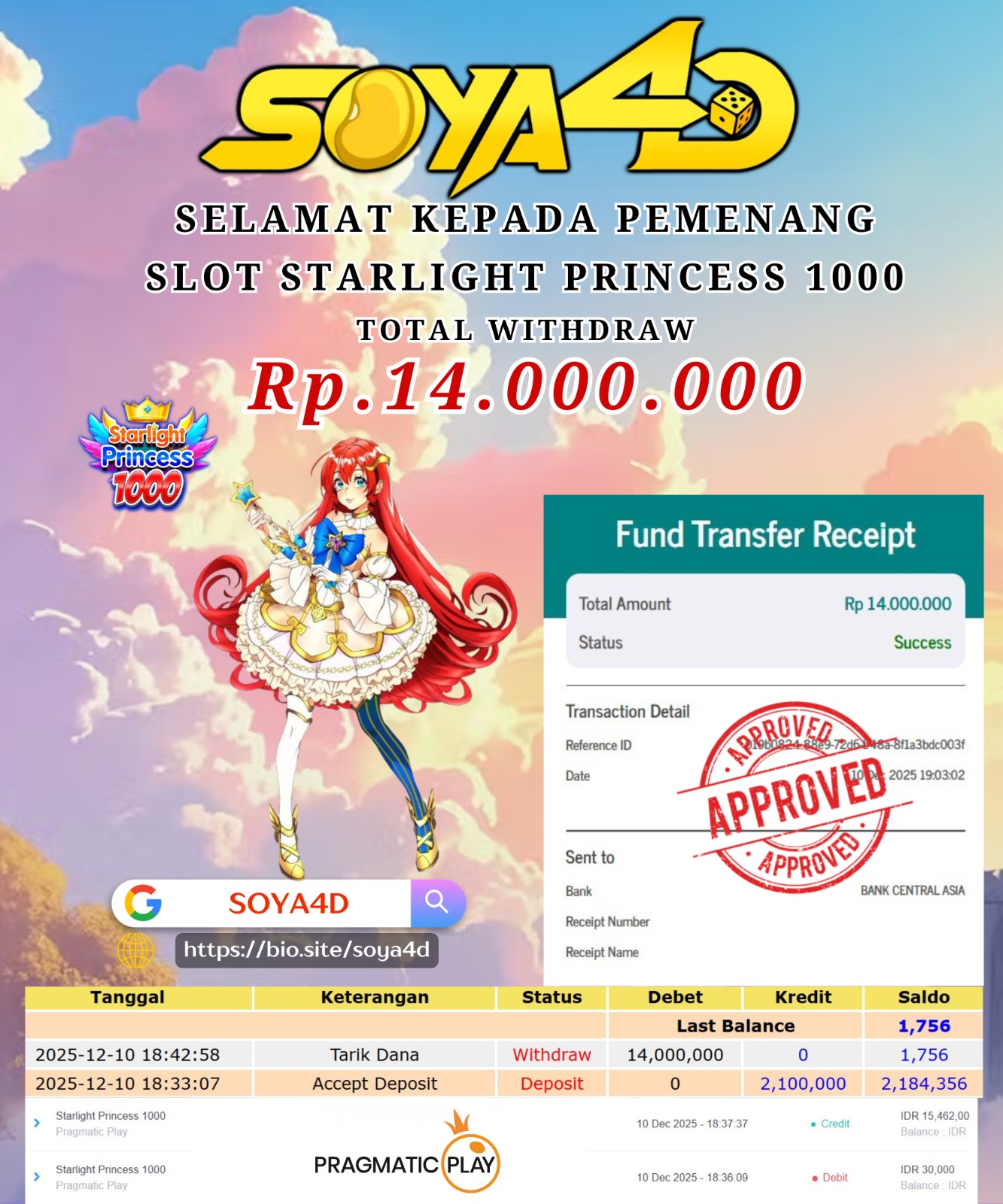 Selamat kepada Userid : iis**** Telah berhasil mendapatkan kemenangan besar pada permainan SLOT STARLIGHT PRINCESS 1000 . Dengan kemenangan Sebesar Rp.14.000.000.-. Setelah mengisi formulir withdraw dengan kurang waktu hanya 1 – 10 menit pihak SOYA4D sudah melakukan transfer kepada pemilik user id. Dan dana sudah masuk ke rekening id tersebut oleh pemenang. Bukti pembayaran yang kami berikan merupakan bukti pembayaran yang SAH / VALID yang langsung di dapatkan melalui tanda transfer transaksi berhasil dari Bank yang di tuju.