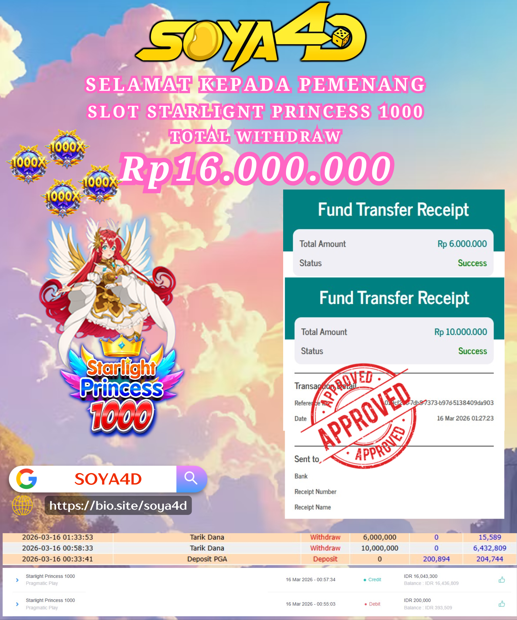 Selamat kepada Userid : DOG***** Telah berhasil mendapatkan kemenangan besar pada permainan SLOT STARLIGHT PRINCESS 1000 . Dengan kemenangan Sebesar Rp. 16.000.000.-. Setelah mengisi formulir withdraw dengan kurang waktu hanya 1 – 10 menit pihak SOYA4D sudah melakukan transfer kepada pemilik user id. Dan dana sudah masuk ke rekening id tersebut oleh pemenang. Bukti pembayaran yang kami berikan merupakan bukti pembayaran yang SAH / VALID yang langsung di dapatkan melalui tanda transfer transaksi berhasil dari Bank yang di tuju. Kami juga mengucapakan banyak Terima Kasih Kepada pemenang karena sudah mempercayakan kami sebagai Bandar Tepercaya yang membayar semua kemenangan member hingga lunas.