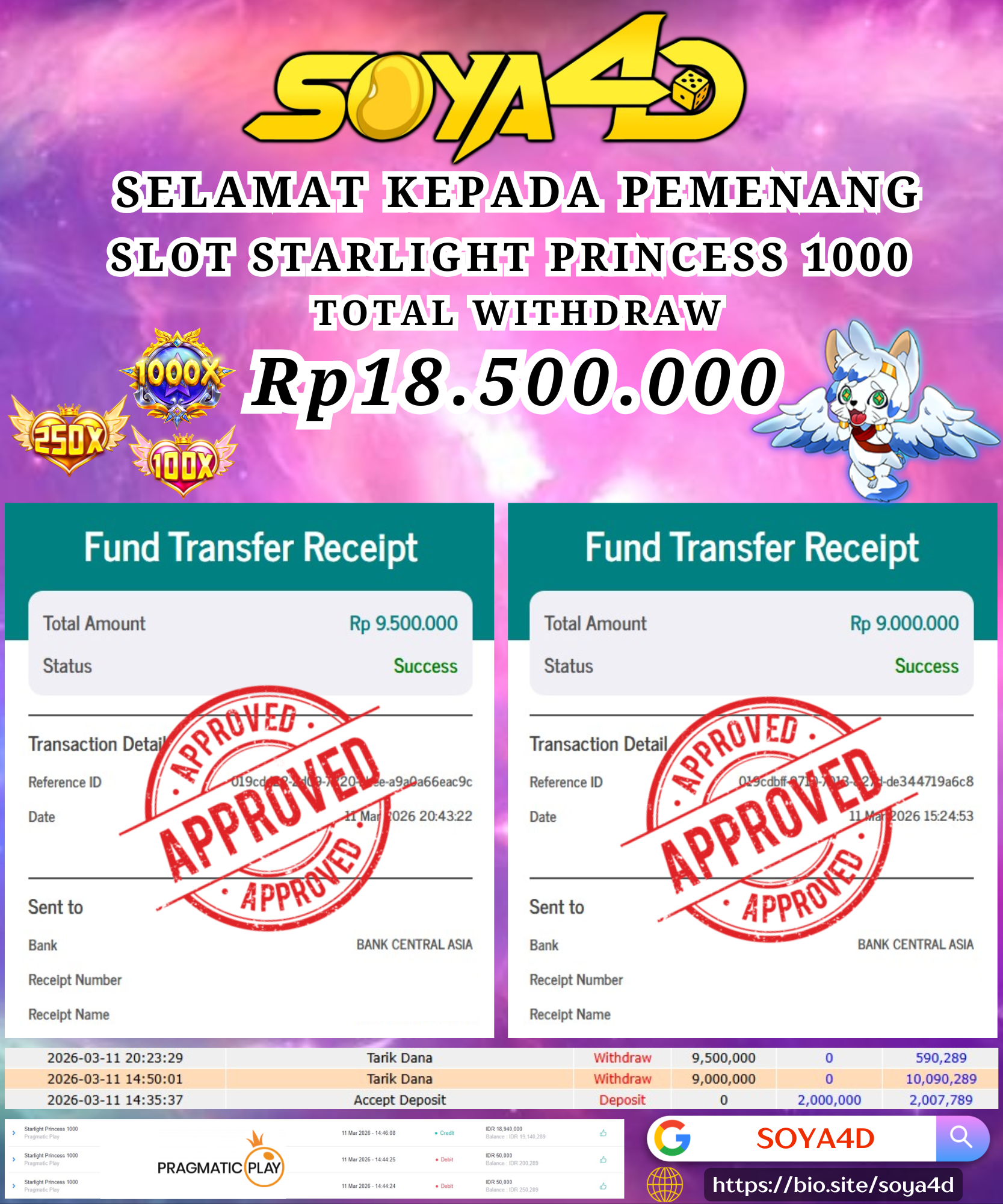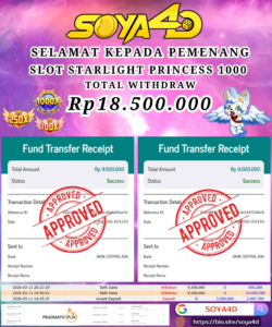 Selamat kepada Userid : BAR***** Telah berhasil mendapatkan kemenangan besar pada permainan SLOT STARLIGHT PRINCESS 1000 . Dengan kemenangan Sebesar Rp. 18.500.000.-. Setelah mengisi formulir withdraw dengan kurang waktu hanya 1 – 10 menit pihak SOYA4D sudah melakukan transfer kepada pemilik user id. Dan dana sudah masuk ke rekening id tersebut oleh pemenang. Bukti pembayaran yang kami berikan merupakan bukti pembayaran yang SAH / VALID yang langsung di dapatkan melalui tanda transfer transaksi berhasil dari Bank yang di tuju. Kami juga mengucapakan banyak Terima Kasih Kepada pemenang karena sudah mempercayakan kami sebagai Bandar Tepercaya yang membayar semua kemenangan member hingga lunas.