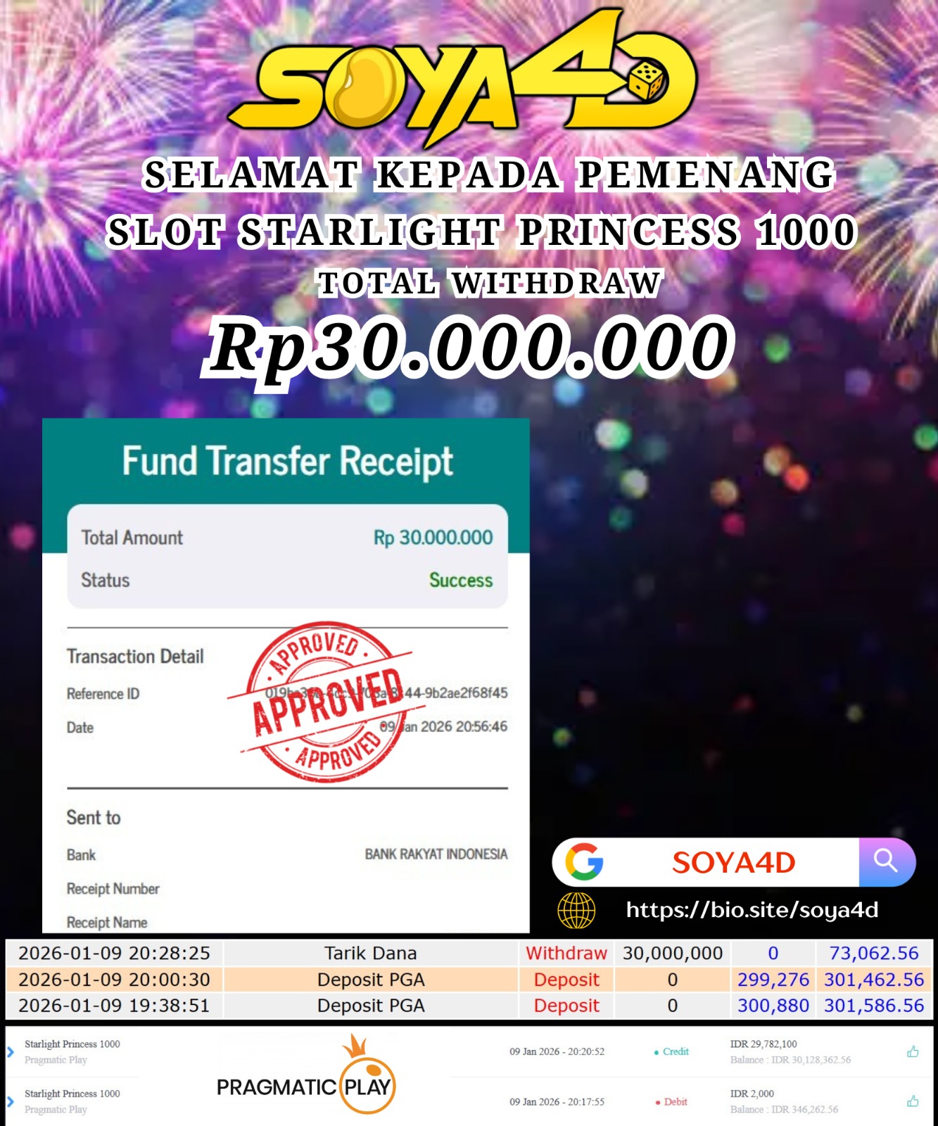 Selamat kepada Userid : Ban**** Telah berhasil mendapatkan kemenangan besar pada permainan SLOT STARLIGHT PRINCESS 1000 . Dengan kemenangan Sebesar Rp. 30.000.000.-. Setelah mengisi formulir withdraw dengan kurang waktu hanya 1 – 10 menit pihak SOYA4D sudah melakukan transfer kepada pemilik user id. Dan dana sudah masuk ke rekening id tersebut oleh pemenang. Bukti pembayaran yang kami berikan merupakan bukti pembayaran yang SAH / VALID yang langsung di dapatkan melalui tanda transfer transaksi berhasil dari Bank yang di tuju. Kami juga mengucapakan banyak Terima Kasih Kepada pemenang karena sudah mempercayakan kami sebagai Bandar Tepercaya yang membayar semua kemenangan member hingga lunas.