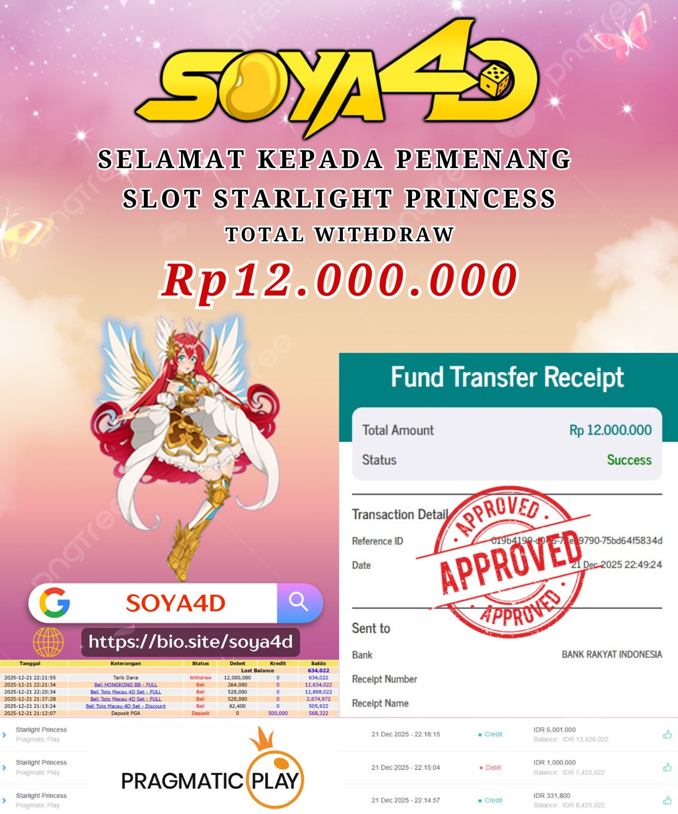 Selamat kepada Userid : Yas**** Telah berhasil mendapatkan kemenangan besar pada permainan SLOT STARLIGHT PRINCESS . Dengan kemenangan Sebesar Rp. 12.000.000.-. Setelah mengisi formulir withdraw dengan kurang waktu hanya 1 – 10 menit pihak SOYA4D sudah melakukan transfer kepada pemilik user id. Dan dana sudah masuk ke rekening id tersebut oleh pemenang. Bukti pembayaran yang kami berikan merupakan bukti pembayaran yang SAH / VALID yang langsung di dapatkan melalui tanda transfer transaksi berhasil dari Bank yang di tuju.