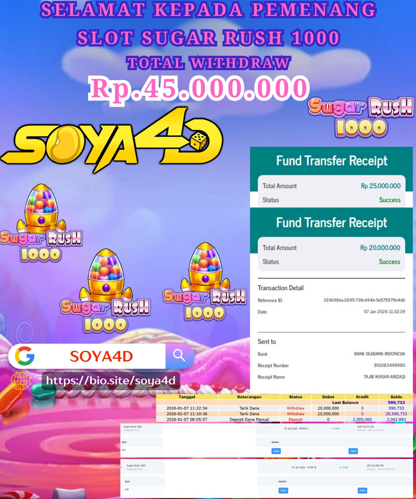 Selamat kepada Userid : Put***** Telah berhasil mendapatkan kemenangan besar pada permainan SLOT SUGAR RUSH 1000 . Dengan kemenangan Sebesar Rp. 45.000.000.-. Setelah mengisi formulir withdraw dengan kurang waktu hanya 1 – 10 menit pihak SOYA4D sudah melakukan transfer kepada pemilik user id. Dan dana sudah masuk ke rekening id tersebut oleh pemenang. Bukti pembayaran yang kami berikan merupakan bukti pembayaran yang SAH / VALID yang langsung di dapatkan melalui tanda transfer transaksi berhasil dari Bank yang di tuju. Kami juga mengucapakan banyak Terima Kasih Kepada pemenang karena sudah mempercayakan kami sebagai Bandar Tepercaya yang membayar semua kemenangan member hingga lunas.