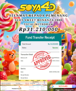 Selamat kepada Userid : KAD***** Telah berhasil mendapatkan kemenangan besar pada permainan SLOT SWEET BONANZA 1000 . Dengan kemenangan Sebesar Rp.31.210.000.-. Setelah mengisi formulir withdraw dengan kurang waktu hanya 1 – 10 menit pihak SOYA4D  sudah melakukan transfer kepada pemilik user id. Dan dana sudah masuk ke rekening id tersebut oleh pemenang. Bukti pembayaran yang kami berikan merupakan bukti pembayaran yang SAH / VALID yang langsung di dapatkan melalui tanda transfer transaksi berhasil dari Bank yang di tuju. Kami juga mengucapakan banyak Terima Kasih Kepada pemenang karena sudah mempercayakan kami sebagai Bandar Tepercaya yang membayar semua kemenangan member hingga lunas.