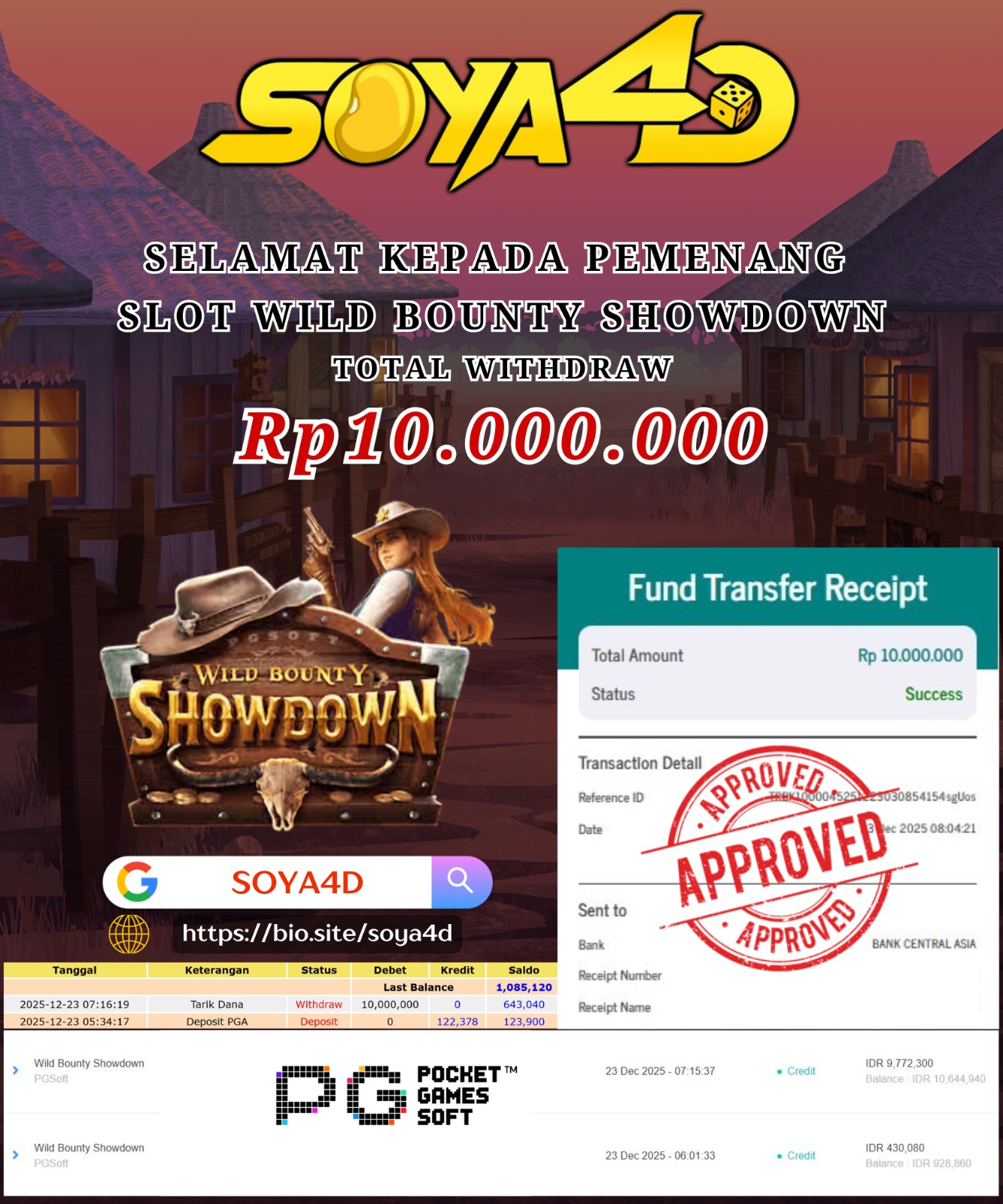 Selamat kepada Userid : Ali**** Telah berhasil mendapatkan kemenangan besar pada permainan SLOT WILD BOUNTY SHOWDOWN . Dengan kemenangan Sebesar Rp. 10.000.000.-. Setelah mengisi formulir withdraw dengan kurang waktu hanya 1 – 10 menit pihak SOYA4D sudah melakukan transfer kepada pemilik user id. Dan dana sudah masuk ke rekening id tersebut oleh pemenang. Bukti pembayaran yang kami berikan merupakan bukti pembayaran yang SAH / VALID yang langsung di dapatkan melalui tanda transfer transaksi berhasil dari Bank yang di tuju.