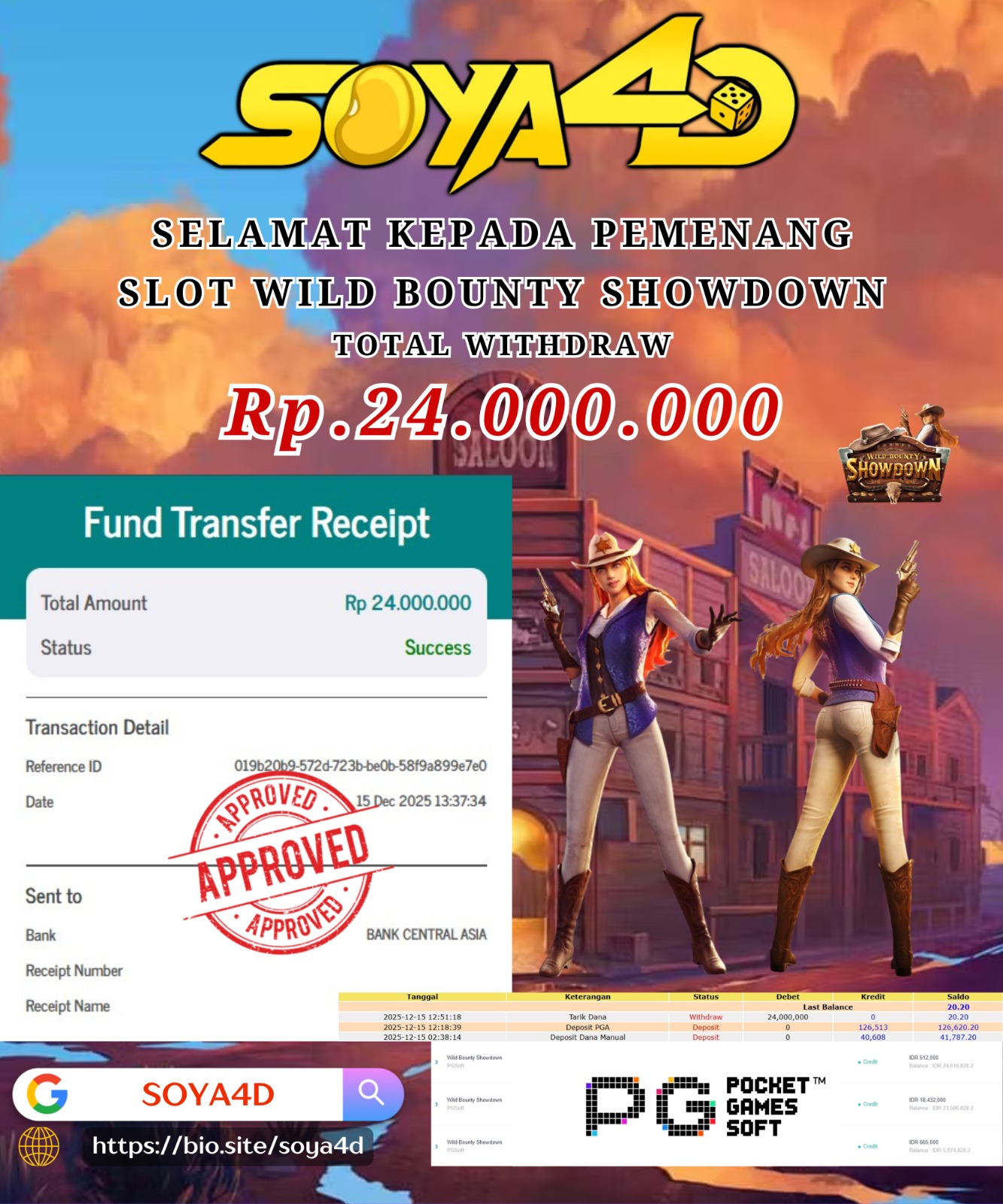 Selamat kepada Userid : Aus**** Telah berhasil mendapatkan kemenangan besar pada permainan SLOT WILD BOUNTY SHOWDOWN . Dengan kemenangan Sebesar Rp.24.000.000.-. Setelah mengisi formulir withdraw dengan kurang waktu hanya 1 – 10 menit pihak SOYA4D sudah melakukan transfer kepada pemilik user id. Dan dana sudah masuk ke rekening id tersebut oleh pemenang. Bukti pembayaran yang kami berikan merupakan bukti pembayaran yang SAH / VALID yang langsung di dapatkan melalui tanda transfer transaksi berhasil dari Bank yang di tuju.