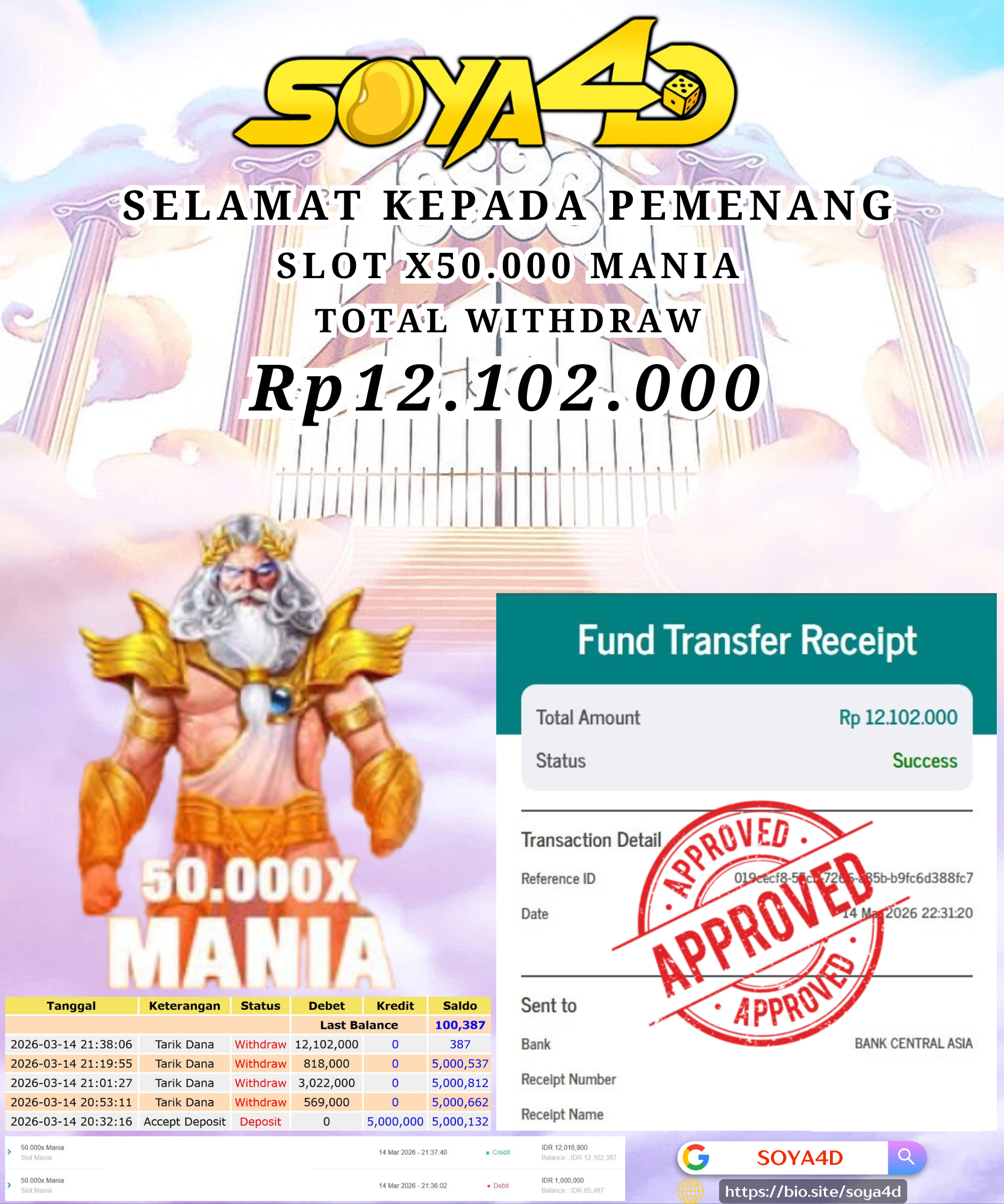 Selamat kepada Userid : TAS***** Telah berhasil mendapatkan kemenangan besar pada permainan SLOT X50.000 MANIA . Dengan kemenangan Sebesar Rp. 12.102.000.-. Setelah mengisi formulir withdraw dengan kurang waktu hanya 1 – 10 menit pihak SOYA4D sudah melakukan transfer kepada pemilik user id. Dan dana sudah masuk ke rekening id tersebut oleh pemenang. Bukti pembayaran yang kami berikan merupakan bukti pembayaran yang SAH / VALID yang langsung di dapatkan melalui tanda transfer transaksi berhasil dari Bank yang di tuju. Kami juga mengucapakan banyak Terima Kasih Kepada pemenang karena sudah mempercayakan kami sebagai Bandar Tepercaya yang membayar semua kemenangan member hingga lunas.