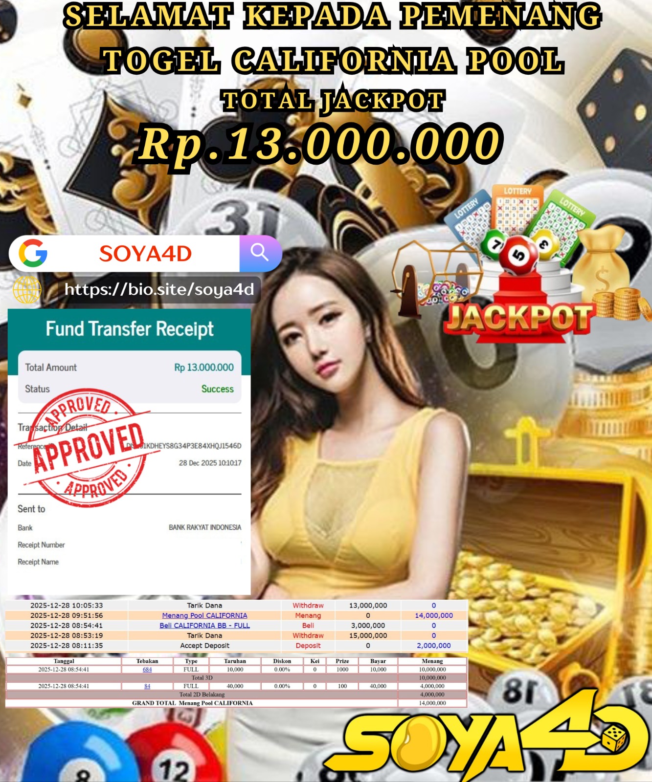 Selamat kepada Userid : Mon***** Telah berhasil mendapatkan kemenangan besar pada permainan TOGEL CALIFORNIA POOL . Dengan kemenangan Sebesar Rp. 13.000.000.-. Setelah mengisi formulir withdraw dengan kurang waktu hanya 1 – 10 menit pihak SOYA4D  sudah melakukan transfer kepada pemilik user id. Dan dana sudah masuk ke rekening id tersebut oleh pemenang. Bukti pembayaran yang kami berikan merupakan bukti pembayaran yang SAH / VALID yang langsung di dapatkan melalui tanda transfer transaksi berhasil dari Bank yang di tuju.