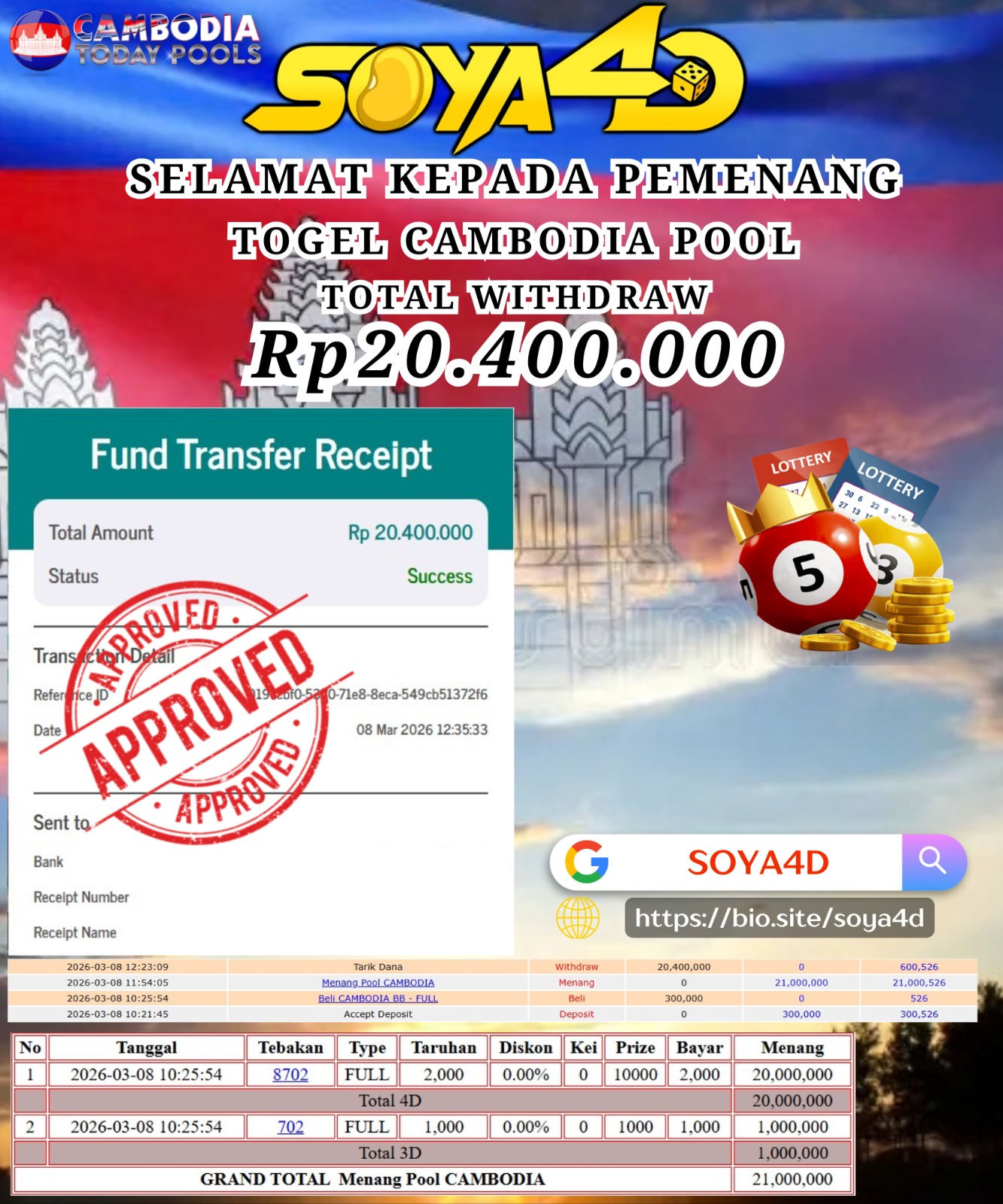 Selamat kepada Userid : Nyo***** Telah berhasil mendapatkan kemenangan besar pada permainan TOGEL CAMBODIA POOL . Dengan kemenangan Sebesar Rp. 20.400.000.-. Setelah mengisi formulir withdraw dengan kurang waktu hanya 1 – 10 menit pihak SOYA4D sudah melakukan transfer kepada pemilik user id. Dan dana sudah masuk ke rekening id tersebut oleh pemenang. Bukti pembayaran yang kami berikan merupakan bukti pembayaran yang SAH / VALID yang langsung di dapatkan melalui tanda transfer transaksi berhasil dari Bank yang di tuju. Kami juga mengucapakan banyak Terima Kasih Kepada pemenang karena sudah mempercayakan kami sebagai Bandar Tepercaya yang membayar semua kemenangan member hingga lunas.