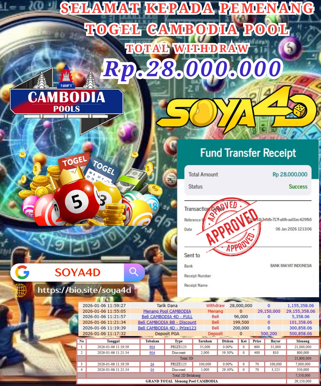 Selamat kepada Userid : Sia***** Telah berhasil mendapatkan kemenangan besar pada permainan TOGEL CAMBODIA POOL . Dengan kemenangan Sebesar Rp. 28.000.000.-. Setelah mengisi formulir withdraw dengan kurang waktu hanya 1 – 10 menit pihak SOYA4D sudah melakukan transfer kepada pemilik user id. Dan dana sudah masuk ke rekening id tersebut oleh pemenang. Bukti pembayaran yang kami berikan merupakan bukti pembayaran yang SAH / VALID yang langsung di dapatkan melalui tanda transfer transaksi berhasil dari Bank yang di tuju. Kami juga mengucapakan banyak Terima Kasih Kepada pemenang karena sudah mempercayakan kami sebagai Bandar Tepercaya yang membayar semua kemenangan member hingga lunas.