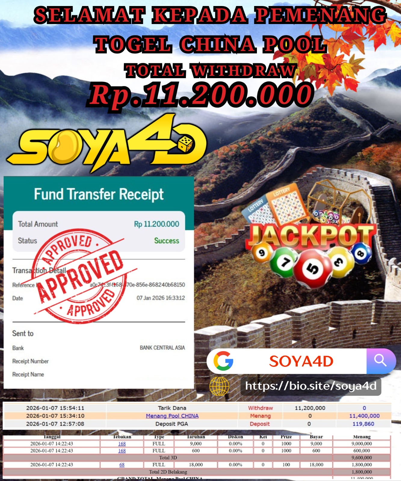 Selamat kepada Userid : Lan***** Telah berhasil mendapatkan kemenangan besar pada permainan TOGEL CHINA POOL . Dengan kemenangan Sebesar Rp. 11.200.000.-. Setelah mengisi formulir withdraw dengan kurang waktu hanya 1 – 10 menit pihak SOYA4D sudah melakukan transfer kepada pemilik user id. Dan dana sudah masuk ke rekening id tersebut oleh pemenang. Bukti pembayaran yang kami berikan merupakan bukti pembayaran yang SAH / VALID yang langsung di dapatkan melalui tanda transfer transaksi berhasil dari Bank yang di tuju. Kami juga mengucapakan banyak Terima Kasih Kepada pemenang karena sudah mempercayakan kami sebagai Bandar Tepercaya yang membayar semua kemenangan member hingga lunas.