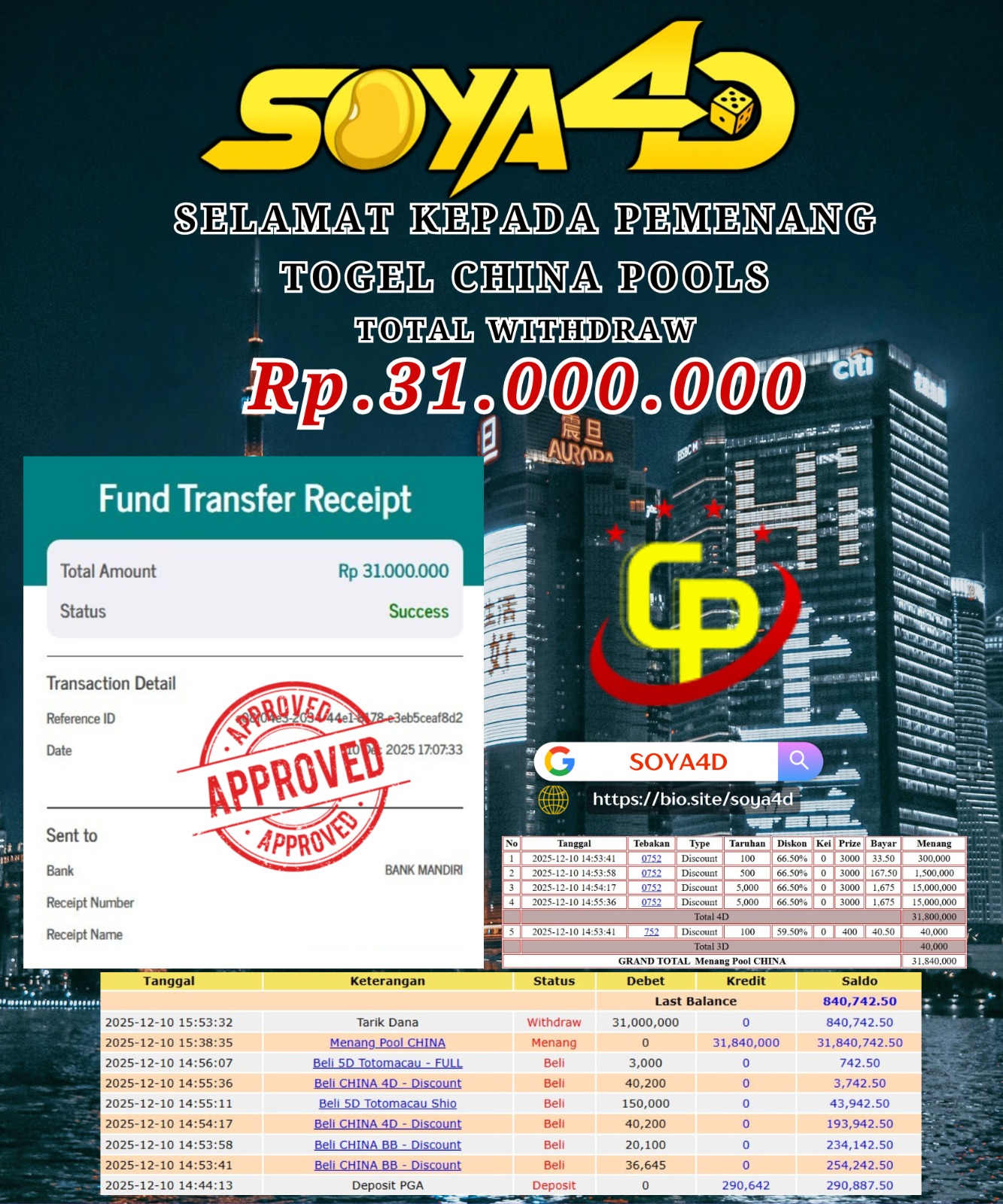 Selamat kepada Userid : bus**** Telah berhasil mendapatkan kemenangan besar pada permainan TOGEL CHINA POOLS. Dengan kemenangan Sebesar Rp.31.000.000.-. Setelah mengisi formulir withdraw dengan kurang waktu hanya 1 – 10 menit pihak SOYA4D sudah melakukan transfer kepada pemilik user id. Dan dana sudah masuk ke rekening id tersebut oleh pemenang. Bukti pembayaran yang kami berikan merupakan bukti pembayaran yang SAH / VALID yang langsung di dapatkan melalui tanda transfer transaksi berhasil dari Bank yang di tuju.