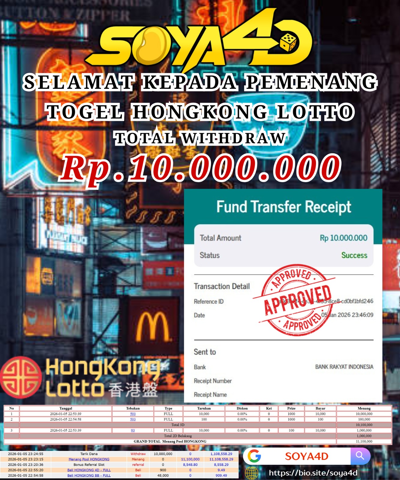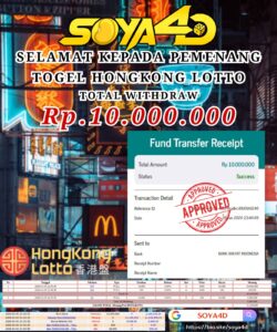 Selamat kepada Userid : Rom***** Telah berhasil mendapatkan kemenangan besar pada permainan TOGEL HONGKONG LOTTO . Dengan kemenangan Sebesar Rp. 10.000.000.-. Setelah mengisi formulir withdraw dengan kurang waktu hanya 1 – 10 menit pihak SOYA4D sudah melakukan transfer kepada pemilik user id. Dan dana sudah masuk ke rekening id tersebut oleh pemenang. Bukti pembayaran yang kami berikan merupakan bukti pembayaran yang SAH / VALID yang langsung di dapatkan melalui tanda transfer transaksi berhasil dari Bank yang di tuju. Kami juga mengucapakan banyak Terima Kasih Kepada pemenang karena sudah mempercayakan kami sebagai Bandar Tepercaya yang membayar semua kemenangan member hingga lunas.