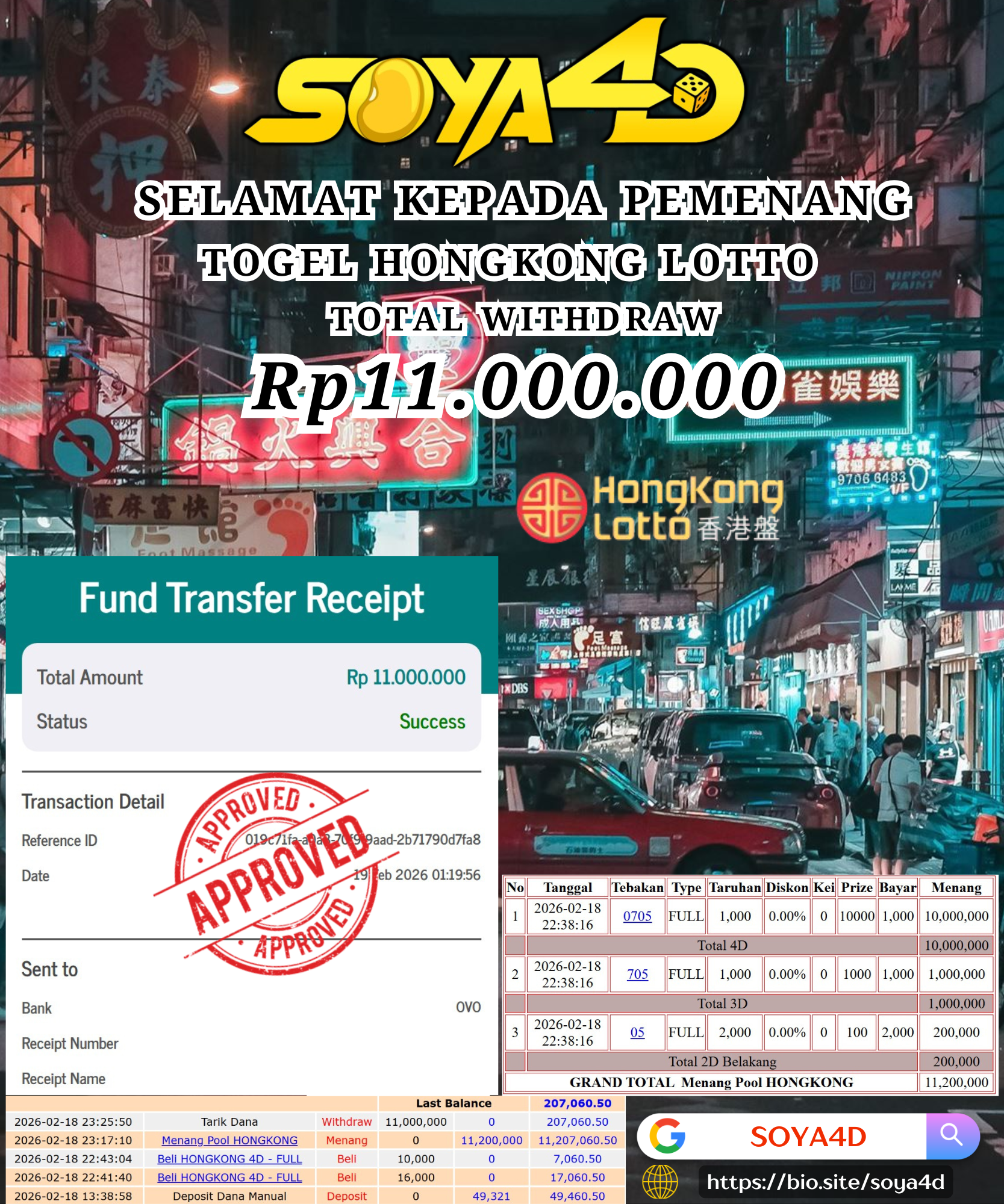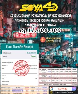 Selamat kepada Userid : GLO***** Telah berhasil mendapatkan kemenangan besar pada permainan TOGEL HONGKONG LOTTO . Dengan kemenangan Sebesar Rp.11.000.000.-. Setelah mengisi formulir withdraw dengan kurang waktu hanya 1 – 10 menit pihak SOYA4D sudah melakukan transfer kepada pemilik user id. Dan dana sudah masuk ke rekening id tersebut oleh pemenang. Bukti pembayaran yang kami berikan merupakan bukti pembayaran yang SAH / VALID yang langsung di dapatkan melalui tanda transfer transaksi berhasil dari Bank yang di tuju. Kami juga mengucapakan banyak Terima Kasih Kepada pemenang karena sudah mempercayakan kami sebagai Bandar Tepercaya yang membayar semua kemenangan member hingga lunas.