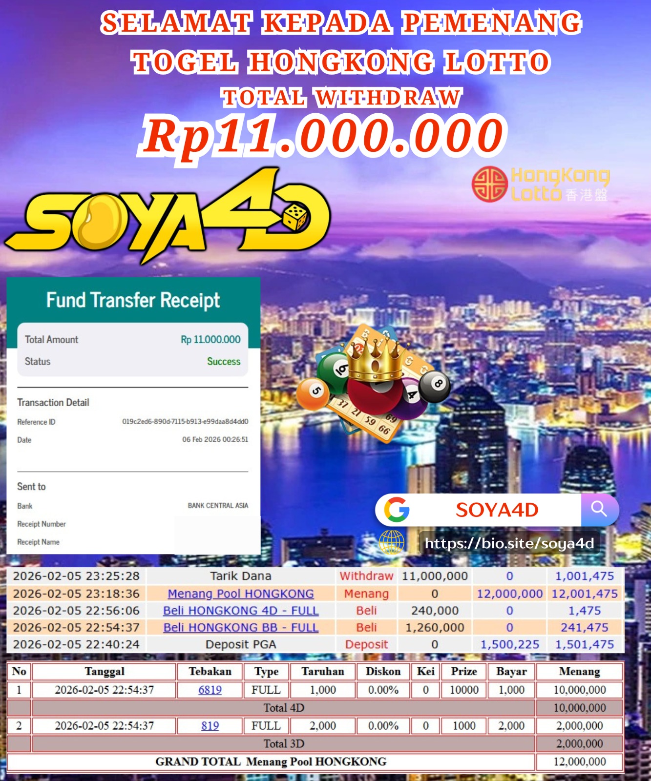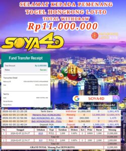 Selamat kepada Userid : Waf*** Telah berhasil mendapatkan kemenangan besar pada permainan TOGEL HONGKONG LOTTO. Dengan kemenangan Sebesar Rp. 11.000.000.-. Setelah mengisi formulir withdraw dengan kurang waktu hanya 1 – 10 menit pihak SOYA4D  sudah melakukan transfer kepada pemilik user id. Dan dana sudah masuk ke rekening id tersebut oleh pemenang. Bukti pembayaran yang kami berikan merupakan bukti pembayaran yang SAH / VALID yang langsung di dapatkan melalui tanda transfer transaksi berhasil dari Bank yang di tuju. Kami juga mengucapakan banyak Terima Kasih Kepada pemenang karena sudah mempercayakan kami sebagai Bandar Tepercaya yang membayar semua kemenangan member hingga lunas.