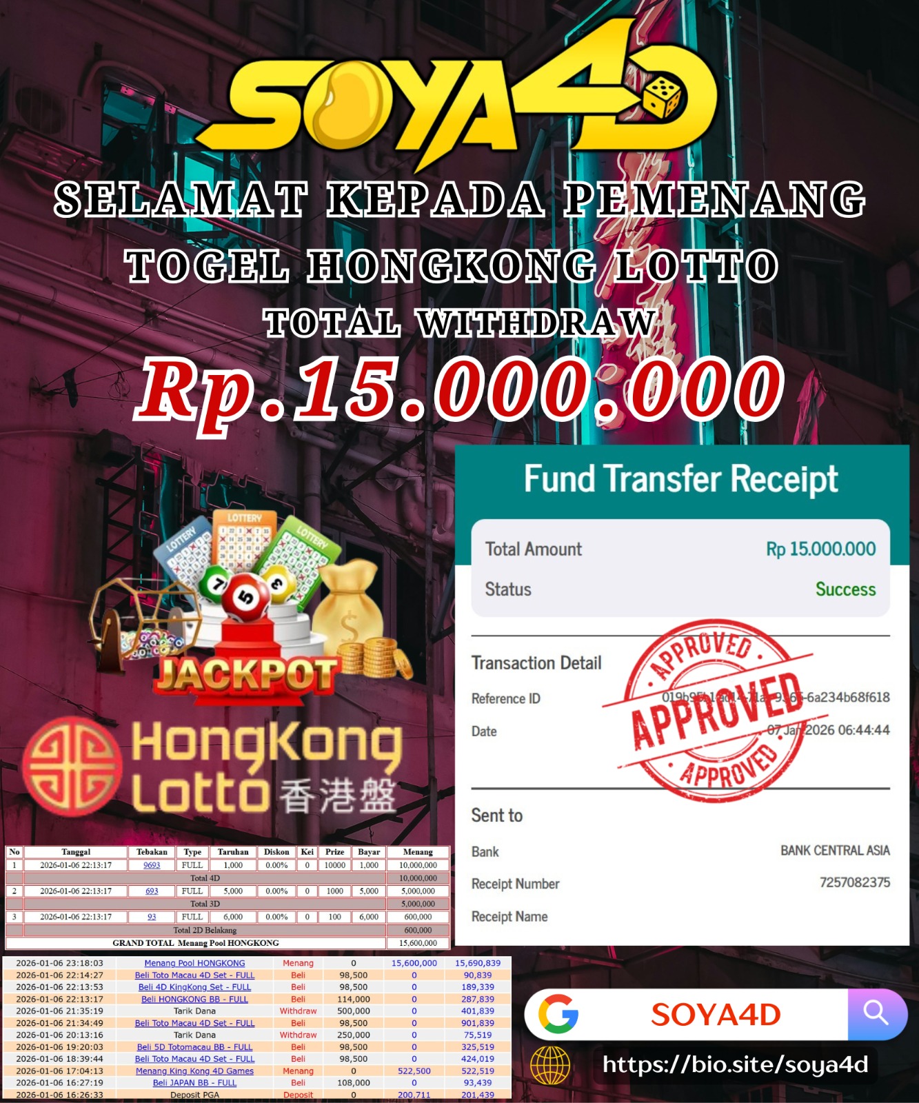 Selamat kepada Userid : Tya***** Telah berhasil mendapatkan kemenangan besar pada permainan TOGEL HONGKONG LOTTO. Dengan kemenangan Sebesar Rp. 15.000.000.-. Setelah mengisi formulir withdraw dengan kurang waktu hanya 1 – 10 menit pihak SOYA4D sudah melakukan transfer kepada pemilik user id. Dan dana sudah masuk ke rekening id tersebut oleh pemenang. Bukti pembayaran yang kami berikan merupakan bukti pembayaran yang SAH / VALID yang langsung di dapatkan melalui tanda transfer transaksi berhasil dari Bank yang di tuju. Kami juga mengucapakan banyak Terima Kasih Kepada pemenang karena sudah mempercayakan kami sebagai Bandar Tepercaya yang membayar semua kemenangan member hingga lunas.