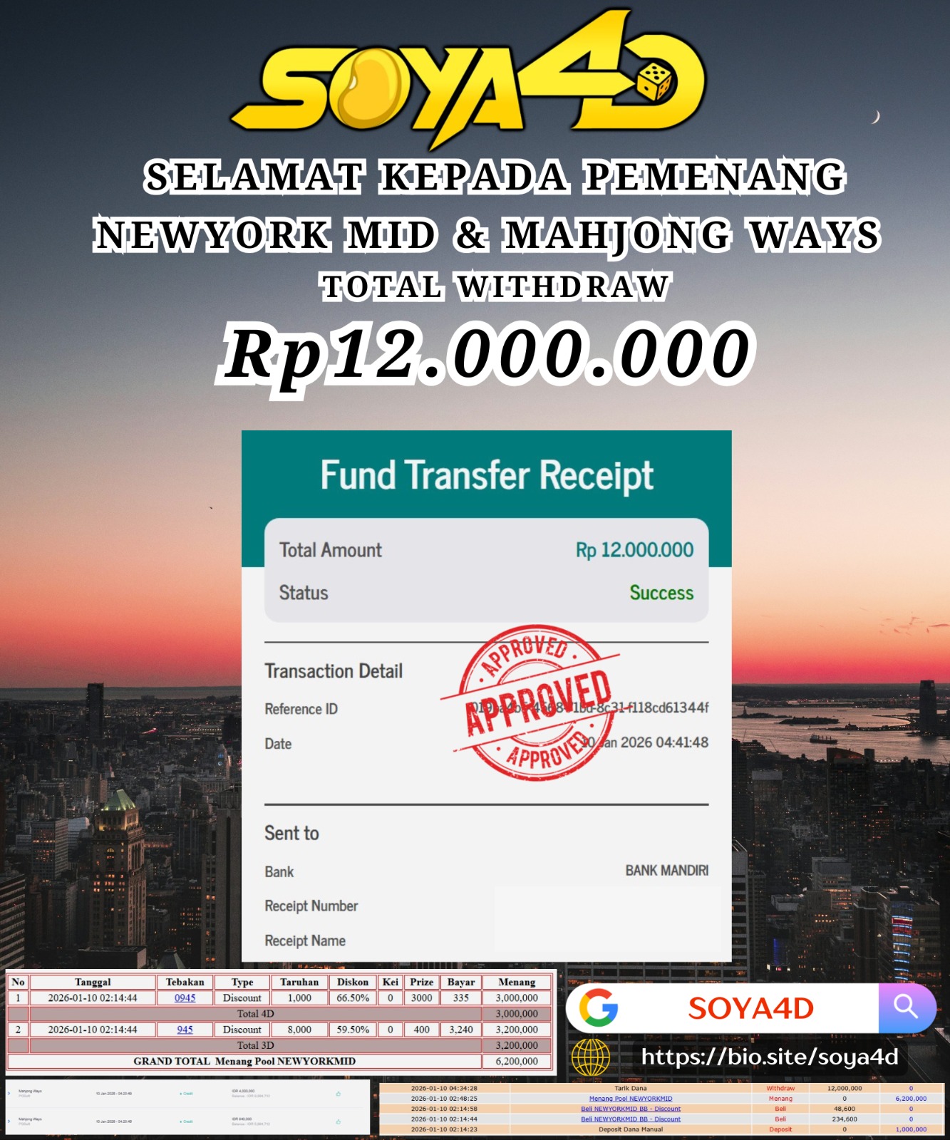 Selamat kepada Userid : Asl*** Telah berhasil mendapatkan kemenangan besar pada permainan TOGEL NEWYORK MID DAN SLOT MAHJONG WAYS. Dengan kemenangan Sebesar Rp. 12.000.000.-. Setelah mengisi formulir withdraw dengan kurang waktu hanya 1 – 10 menit pihak SOYA4D sudah melakukan transfer kepada pemilik user id. Dan dana sudah masuk ke rekening id tersebut oleh pemenang. Bukti pembayaran yang kami berikan merupakan bukti pembayaran yang SAH / VALID yang langsung di dapatkan melalui tanda transfer transaksi berhasil dari Bank yang di tuju. Kami juga mengucapakan banyak Terima Kasih Kepada pemenang karena sudah mempercayakan kami sebagai Bandar Tepercaya yang membayar semua kemenangan member hingga lunas.