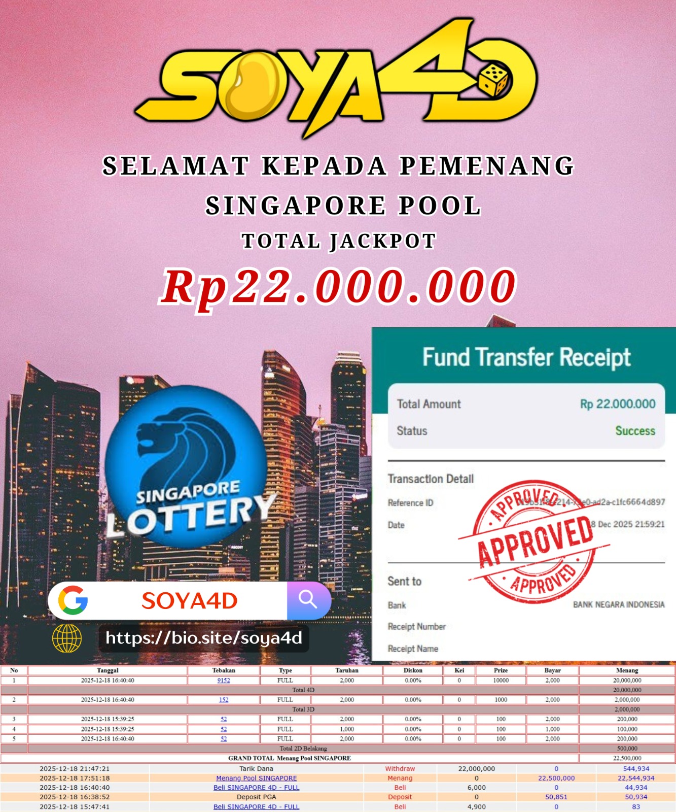 Selamat kepada Userid : Aul**** Telah berhasil mendapatkan kemenangan besar pada permainan TOGEL SINGAPORE POOL . Dengan kemenangan Sebesar Rp.22.000.000.-. Setelah mengisi formulir withdraw dengan kurang waktu hanya 1 – 10 menit pihak SOYA4D sudah melakukan transfer kepada pemilik user id. Dan dana sudah masuk ke rekening id tersebut oleh pemenang. Bukti pembayaran yang kami berikan merupakan bukti pembayaran yang SAH / VALID yang langsung di dapatkan melalui tanda transfer transaksi berhasil dari Bank yang di tuju.