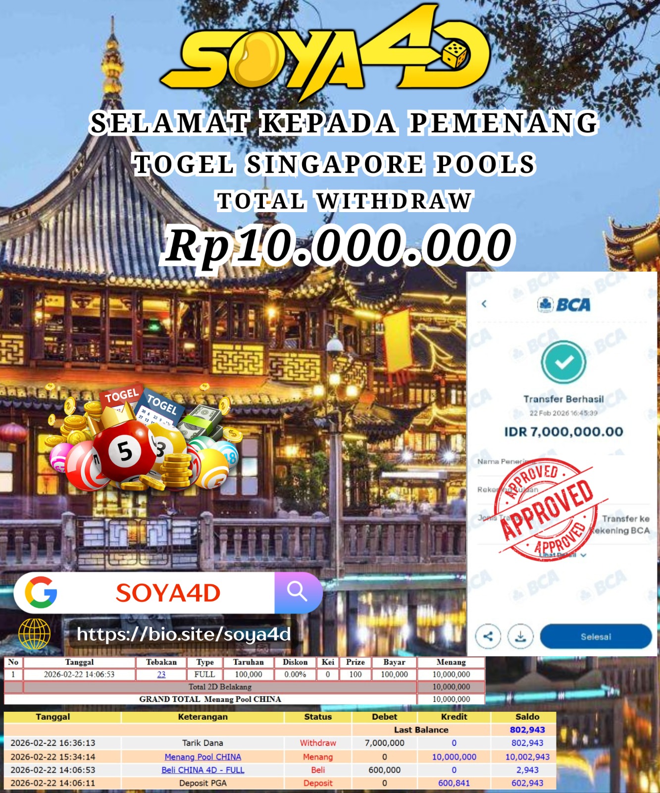 Selamat kepada Userid : Sen***** Telah berhasil mendapatkan kemenangan besar pada permainan TOGEL SINGAPORE POOLS  . Dengan kemenangan Sebesar Rp. 10.000.000.-. Setelah mengisi formulir withdraw dengan kurang waktu hanya 1 – 10 menit pihak SOYA4D  sudah melakukan transfer kepada pemilik user id. Dan dana sudah masuk ke rekening id tersebut oleh pemenang. Bukti pembayaran yang kami berikan merupakan bukti pembayaran yang SAH / VALID yang langsung di dapatkan melalui tanda transfer transaksi berhasil dari Bank yang di tuju. Kami juga mengucapakan banyak Terima Kasih Kepada pemenang karena sudah mempercayakan kami sebagai Bandar Tepercaya yang membayar semua kemenangan member hingga lunas.