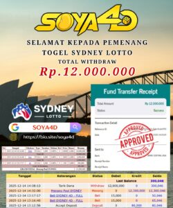 Selamat kepada Userid : Ase**** Telah berhasil mendapatkan kemenangan besar pada permainan TOGEL SYDNEY LOTTO . Dengan kemenangan Sebesar Rp.12.000.000.-. Setelah mengisi formulir withdraw dengan kurang waktu hanya 1 – 10 menit pihak SOYA4D sudah melakukan transfer kepada pemilik user id. Dan dana sudah masuk ke rekening id tersebut oleh pemenang. Bukti pembayaran yang kami berikan merupakan bukti pembayaran yang SAH / VALID yang langsung di dapatkan melalui tanda transfer transaksi berhasil dari Bank yang di tuju.