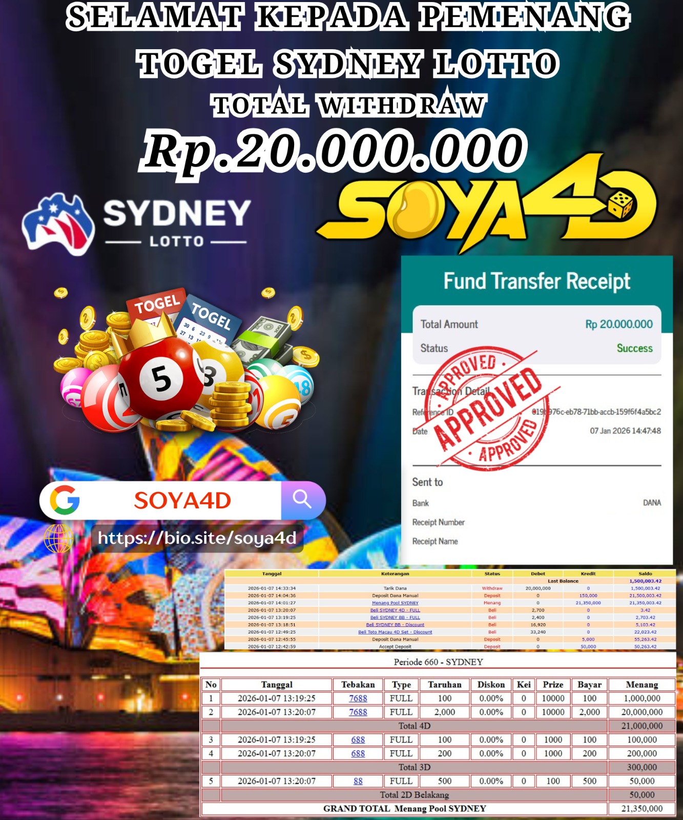 Selamat kepada Userid : Sin***** Telah berhasil mendapatkan kemenangan besar pada permainan TOGEL SYDNEY LOTTO . Dengan kemenangan Sebesar Rp. 20.000.000.-. Setelah mengisi formulir withdraw dengan kurang waktu hanya 1 – 10 menit pihak SOYA4D sudah melakukan transfer kepada pemilik user id. Dan dana sudah masuk ke rekening id tersebut oleh pemenang. Bukti pembayaran yang kami berikan merupakan bukti pembayaran yang SAH / VALID yang langsung di dapatkan melalui tanda transfer transaksi berhasil dari Bank yang di tuju. Kami juga mengucapakan banyak Terima Kasih Kepada pemenang karena sudah mempercayakan kami sebagai Bandar Tepercaya yang membayar semua kemenangan member hingga lunas.