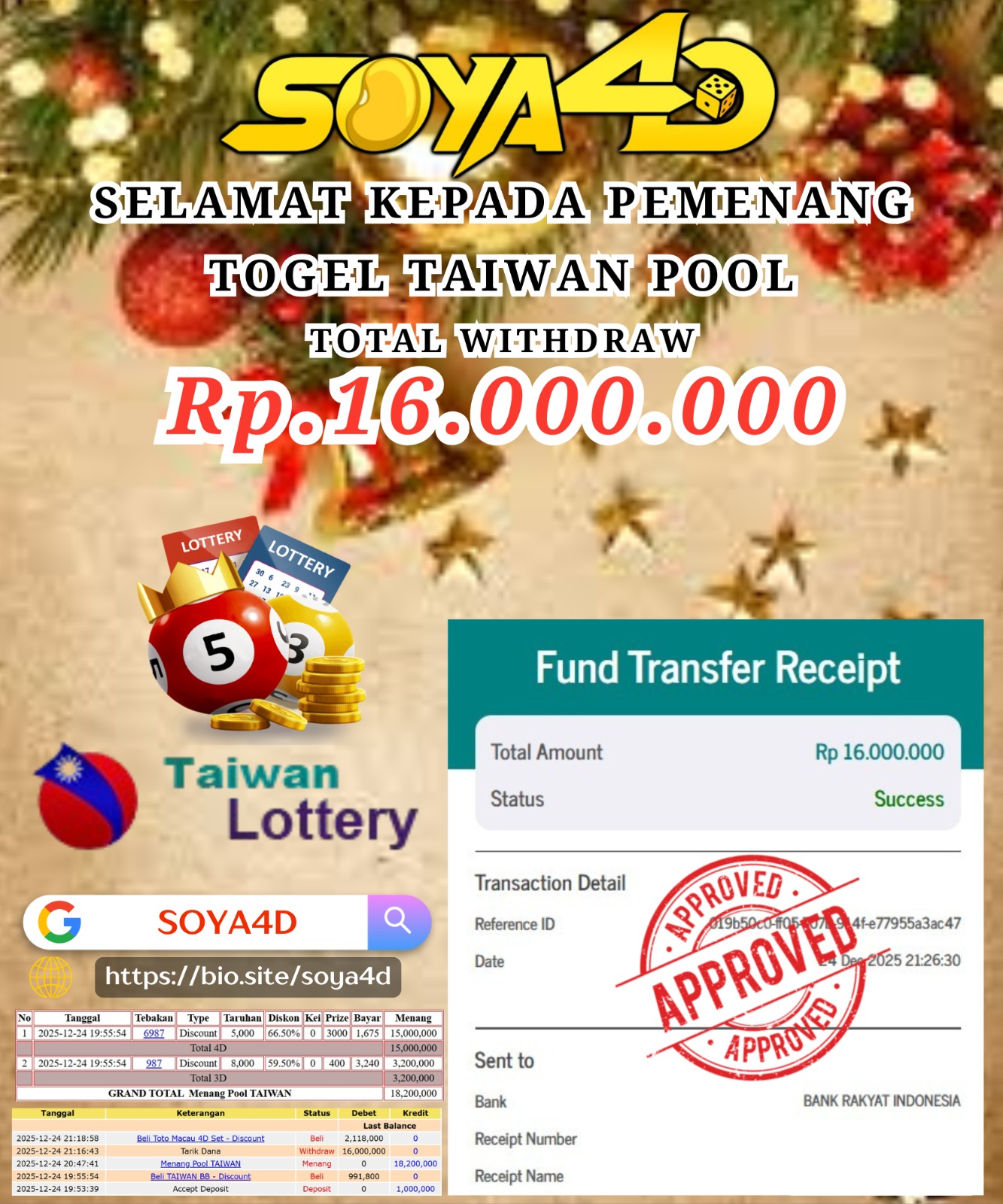 Selamat kepada Userid : And***** Telah berhasil mendapatkan kemenangan besar pada permainan TOGEL TAIWAN POOL. Dengan kemenangan Sebesar Rp. 16.000.000.-. Setelah mengisi formulir withdraw dengan kurang waktu hanya 1 – 10 menit pihak SOYA4D sudah melakukan transfer kepada pemilik user id. Dan dana sudah masuk ke rekening id tersebut oleh pemenang. Bukti pembayaran yang kami berikan merupakan bukti pembayaran yang SAH / VALID yang langsung di dapatkan melalui tanda transfer transaksi berhasil dari Bank yang di tuju.