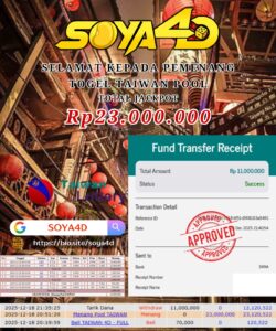 Selamat kepada Userid : Imu**** Telah berhasil mendapatkan kemenangan besar pada permainan TOGEL TAIWAN POOL . Dengan kemenangan Sebesar Rp.23.000.000.-. Setelah mengisi formulir withdraw dengan kurang waktu hanya 1 – 10 menit pihak SOYA4D sudah melakukan transfer kepada pemilik user id. Dan dana sudah masuk ke rekening id tersebut oleh pemenang. Bukti pembayaran yang kami berikan merupakan bukti pembayaran yang SAH / VALID yang langsung di dapatkan melalui tanda transfer transaksi berhasil dari Bank yang di tuju.