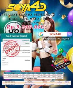 Selamat kepada Userid : Has**** Telah berhasil mendapatkan kemenangan besar pada permainan TOGEL TOTO MACAU 4D . Dengan kemenangan Sebesar Rp.9.500.000.-. Setelah mengisi formulir withdraw dengan kurang waktu hanya 1 – 10 menit pihak SOYA4D sudah melakukan transfer kepada pemilik user id. Dan dana sudah masuk ke rekening id tersebut oleh pemenang. Bukti pembayaran yang kami berikan merupakan bukti pembayaran yang SAH / VALID yang langsung di dapatkan melalui tanda transfer transaksi berhasil dari Bank yang di tuju.