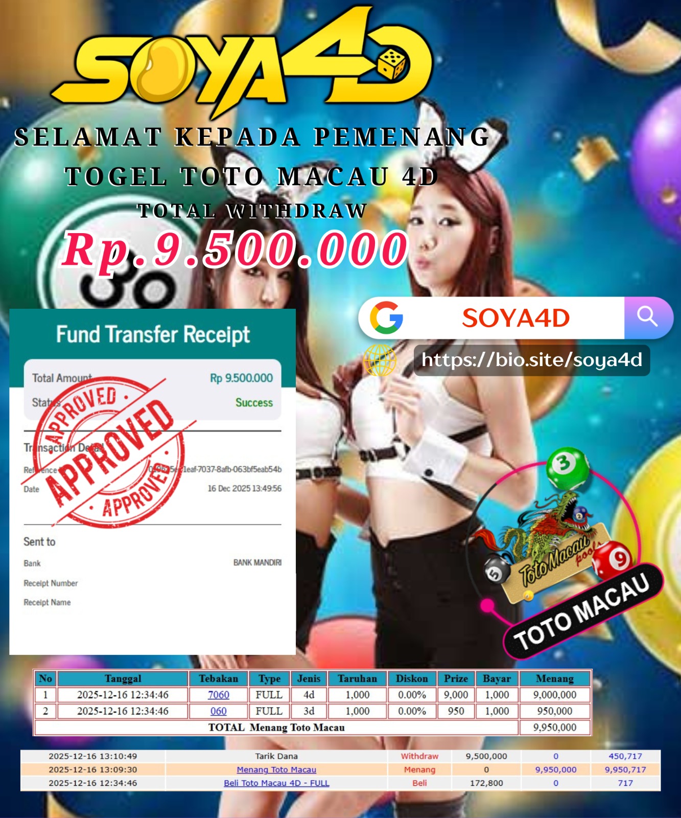 Selamat kepada Userid : Has**** Telah berhasil mendapatkan kemenangan besar pada permainan TOGEL TOTO MACAU 4D . Dengan kemenangan Sebesar Rp.9.500.000.-. Setelah mengisi formulir withdraw dengan kurang waktu hanya 1 – 10 menit pihak SOYA4D sudah melakukan transfer kepada pemilik user id. Dan dana sudah masuk ke rekening id tersebut oleh pemenang. Bukti pembayaran yang kami berikan merupakan bukti pembayaran yang SAH / VALID yang langsung di dapatkan melalui tanda transfer transaksi berhasil dari Bank yang di tuju.
