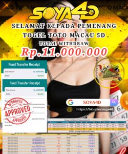 Selamat kepada Userid : Mac**** Telah berhasil mendapatkan kemenangan besar pada permainan TOGEL TOTO MACAU 5D . Dengan kemenangan Sebesar Rp. 11.000.000.-. Setelah mengisi formulir withdraw dengan kurang waktu hanya 1 – 10 menit pihak SOYA4D sudah melakukan transfer kepada pemilik user id. Dan dana sudah masuk ke rekening id tersebut oleh pemenang. Bukti pembayaran yang kami berikan merupakan bukti pembayaran yang SAH / VALID yang langsung di dapatkan melalui tanda transfer transaksi berhasil dari Bank yang di tuju.