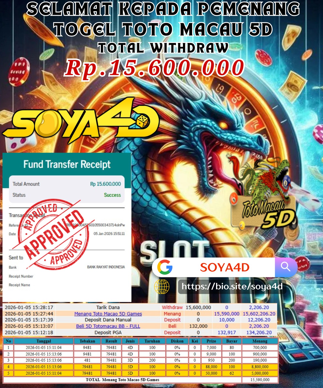 Selamat kepada Userid : Sep***** Telah berhasil mendapatkan kemenangan besar pada permainan TOGEL TOTO MACAU 5D . Dengan kemenangan Sebesar Rp. 15.600.000.-. Setelah mengisi formulir withdraw dengan kurang waktu hanya 1 – 10 menit pihak SOYA4D sudah melakukan transfer kepada pemilik user id. Dan dana sudah masuk ke rekening id tersebut oleh pemenang. Bukti pembayaran yang kami berikan merupakan bukti pembayaran yang SAH / VALID yang langsung di dapatkan melalui tanda transfer transaksi berhasil dari Bank yang di tuju.