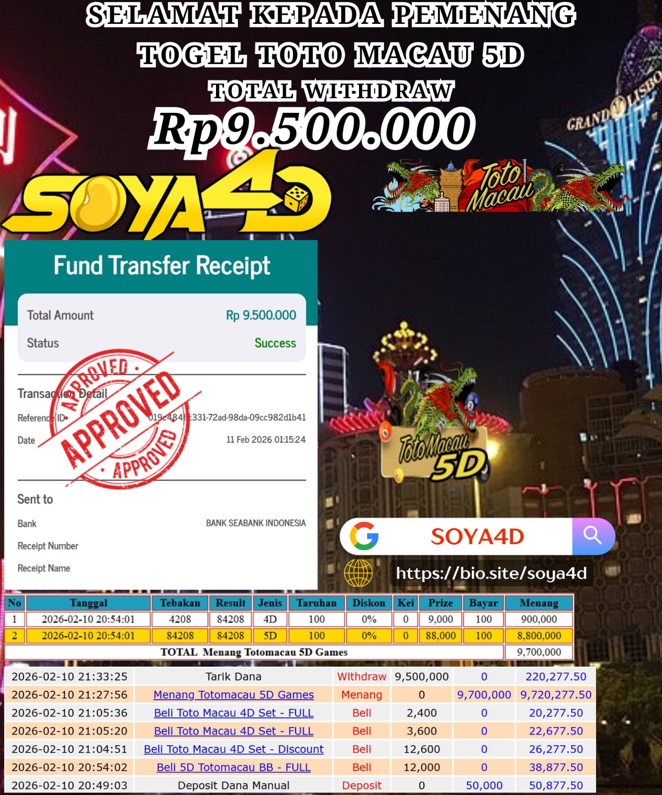 Selamat kepada Userid : Wen*** Telah berhasil mendapatkan kemenangan besar pada permainan TOGEL TOTO MACAU 5D. Dengan kemenangan Sebesar Rp. 9.500.000.-. Setelah mengisi formulir withdraw dengan kurang waktu hanya 1 – 10 menit pihak SOYA4D sudah melakukan transfer kepada pemilik user id. Dan dana sudah masuk ke rekening id tersebut oleh pemenang. Bukti pembayaran yang kami berikan merupakan bukti pembayaran yang SAH / VALID yang langsung di dapatkan melalui tanda transfer transaksi berhasil dari Bank yang di tuju. Kami juga mengucapakan banyak Terima Kasih Kepada pemenang karena sudah mempercayakan kami sebagai Bandar Tepercaya yang membayar semua kemenangan member hingga lunas.