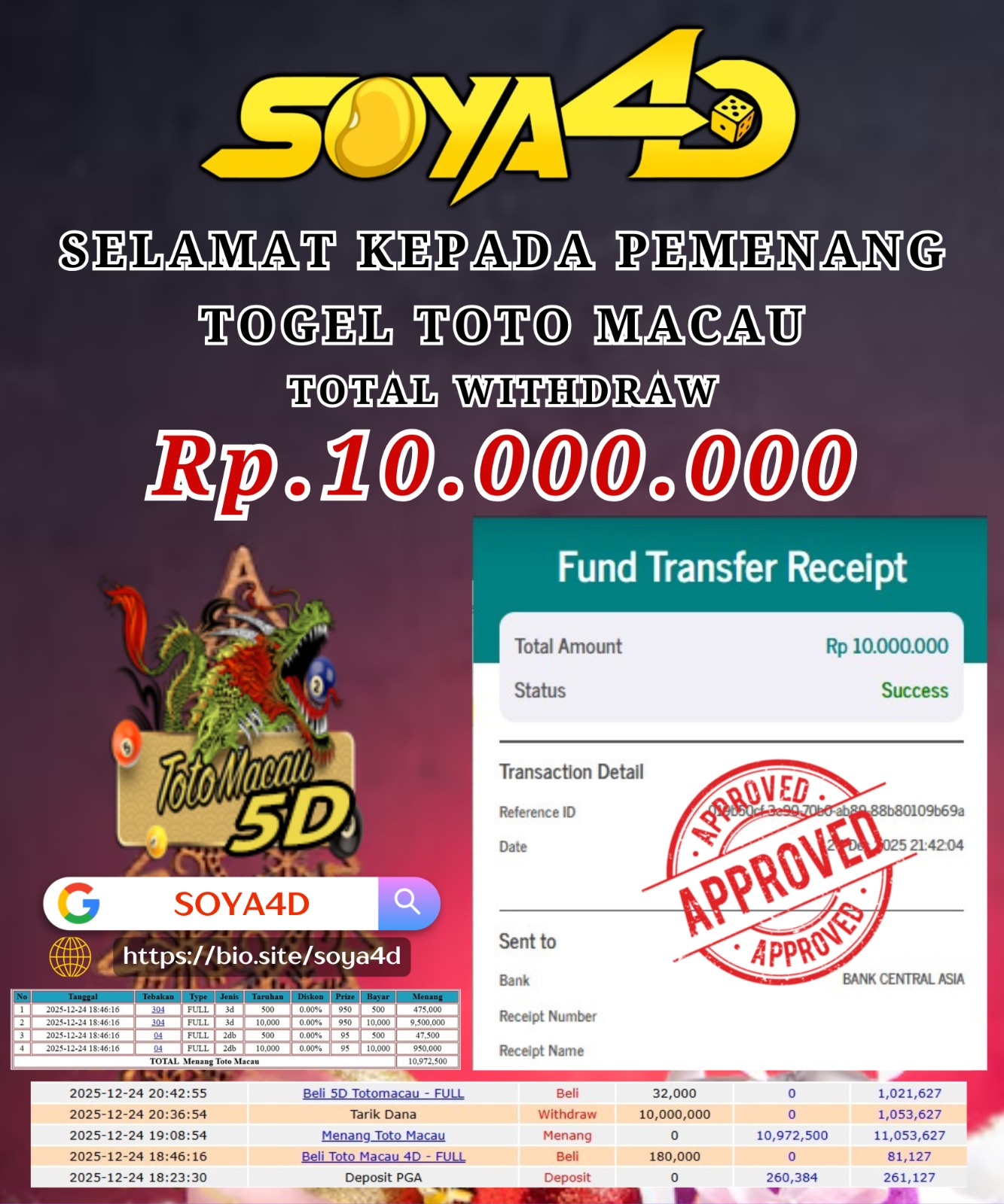 Selamat kepada Userid : Tha***** Telah berhasil mendapatkan kemenangan besar pada permainan TOGEL TOTO MACAU. Dengan kemenangan Sebesar Rp. 10.000.000.-. Setelah mengisi formulir withdraw dengan kurang waktu hanya 1 – 10 menit pihak SOYA4D  sudah melakukan transfer kepada pemilik user id. Dan dana sudah masuk ke rekening id tersebut oleh pemenang. Bukti pembayaran yang kami berikan merupakan bukti pembayaran yang SAH / VALID yang langsung di dapatkan melalui tanda transfer transaksi berhasil dari Bank yang di tuju.