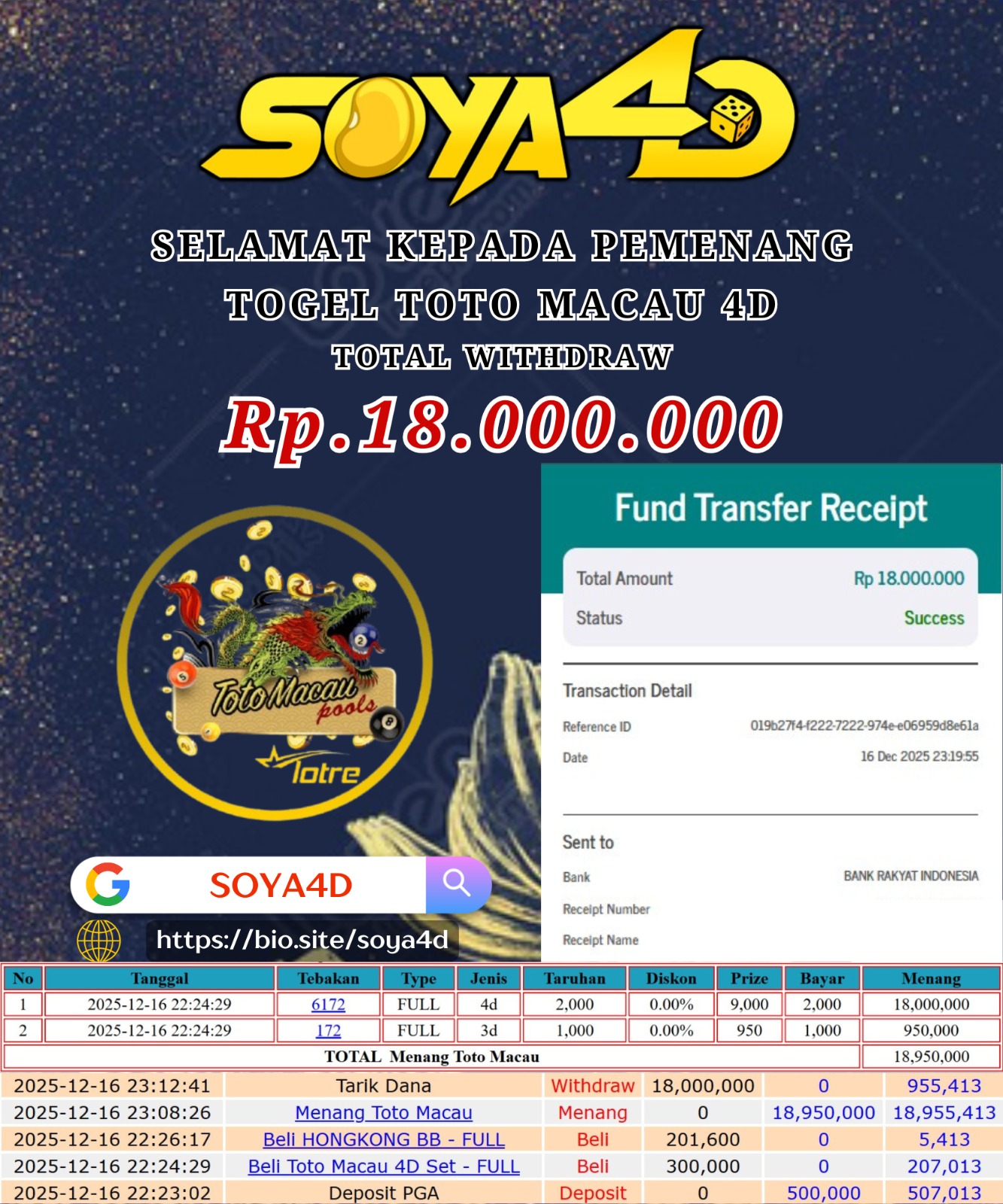 Selamat kepada Userid : IND**** Telah berhasil mendapatkan kemenangan besar pada permainan TOGEL TOTO MACAU . Dengan kemenangan Sebesar Rp.18.000.000.-. Setelah mengisi formulir withdraw dengan kurang waktu hanya 1 – 10 menit pihak SOYA4D  sudah melakukan transfer kepada pemilik user id. Dan dana sudah masuk ke rekening id tersebut oleh pemenang. Bukti pembayaran yang kami berikan merupakan bukti pembayaran yang SAH / VALID yang langsung di dapatkan melalui tanda transfer transaksi berhasil dari Bank yang di tuju.