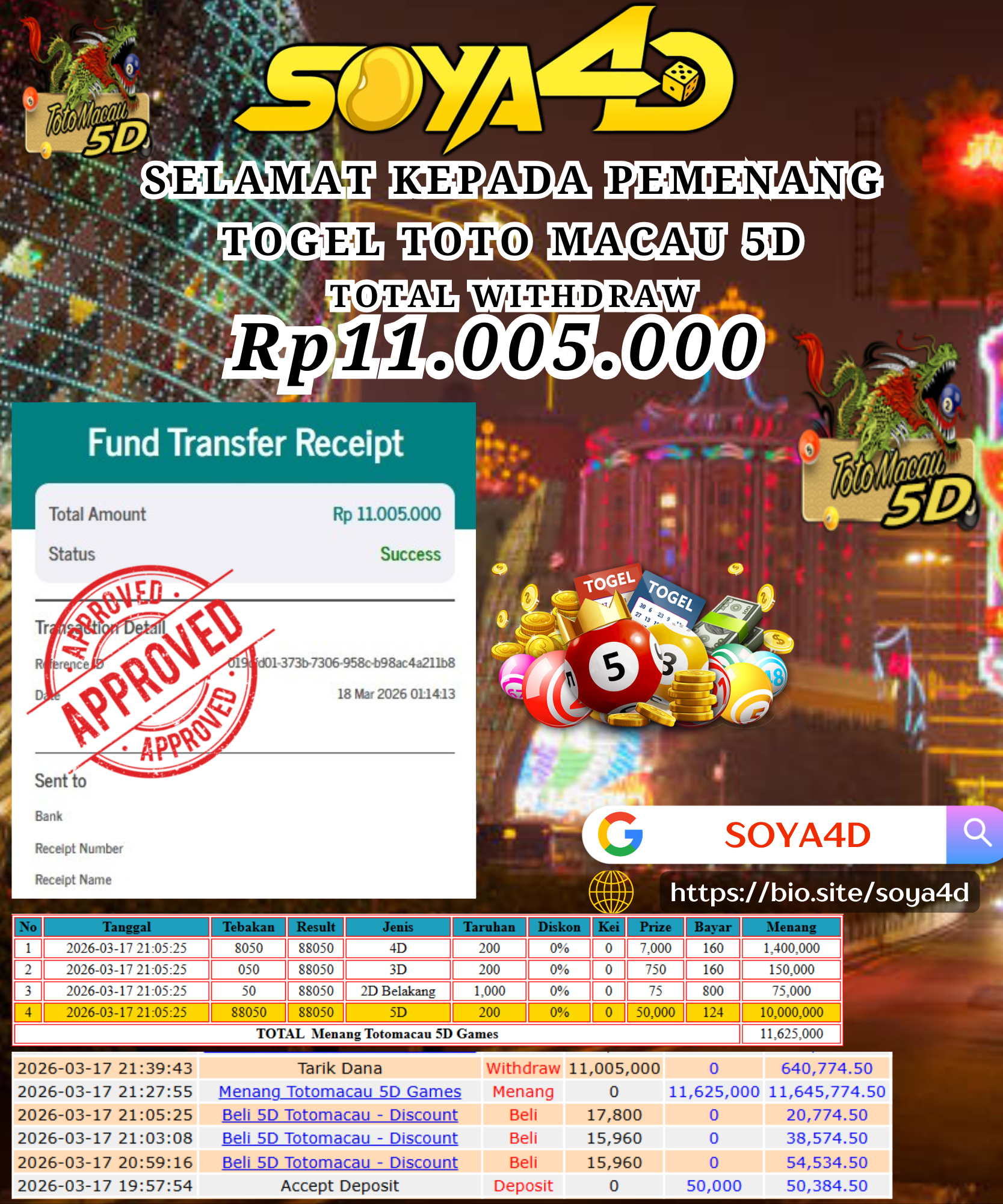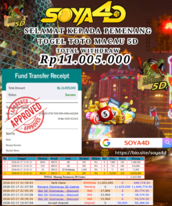 Selamat kepada Userid : KON***** Telah berhasil mendapatkan kemenangan besar pada permainan TOGEL TOTOMACAU 5D Dengan kemenangan Sebesar Rp. 11.005.000.-. Setelah mengisi formulir withdraw dengan kurang waktu hanya 1 – 10 menit pihak SOYA4D  sudah melakukan transfer kepada pemilik user id. Dan dana sudah masuk ke rekening id tersebut oleh pemenang. Bukti pembayaran yang kami berikan merupakan bukti pembayaran yang SAH / VALID yang langsung di dapatkan melalui tanda transfer transaksi berhasil dari Bank yang di tuju. Kami juga mengucapakan banyak Terima Kasih Kepada pemenang karena sudah mempercayakan kami sebagai Bandar Tepercaya yang membayar semua kemenangan member hingga lunas.