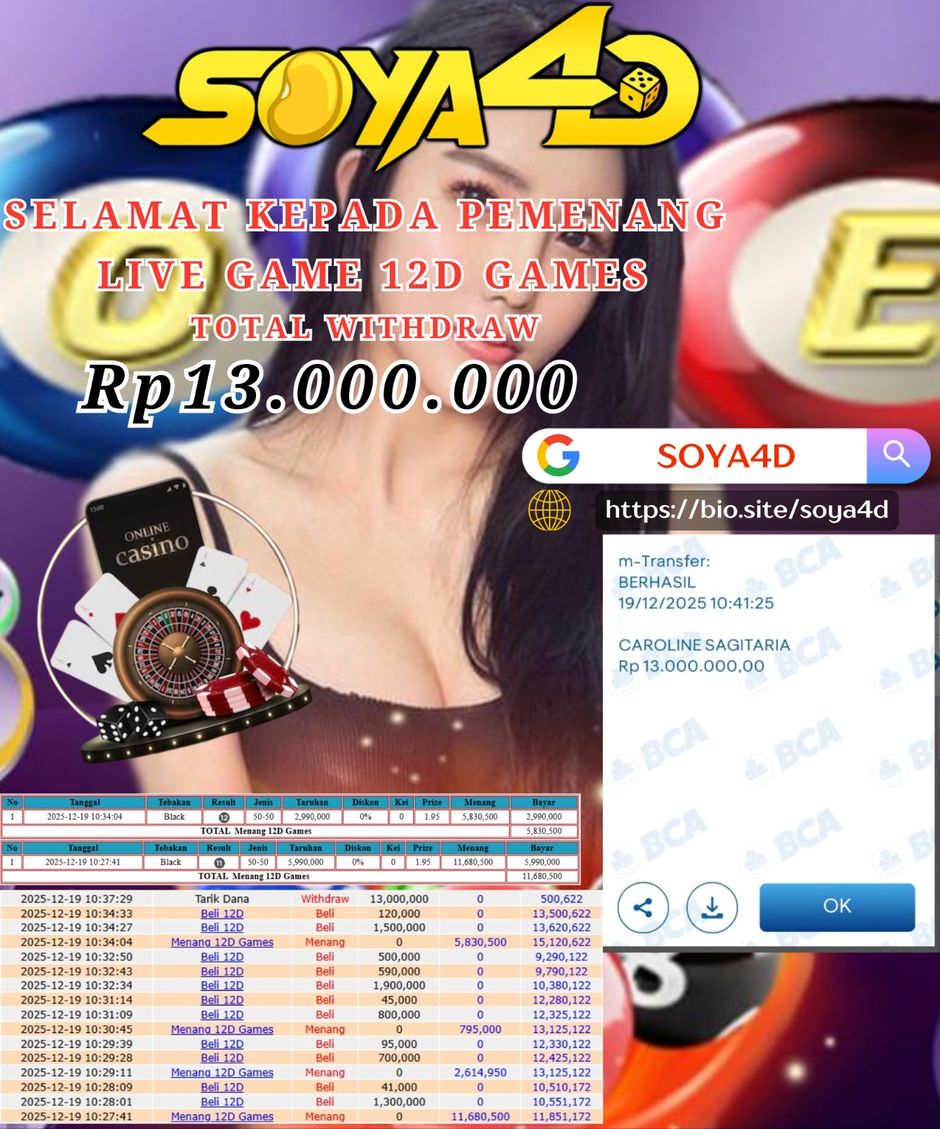 Selamat kepada Userid : Dal**** Telah berhasil mendapatkan kemenangan besar pada permainan LIVE GAME 12D GAMES . Dengan kemenangan Sebesar Rp.13.000.000.-. Setelah mengisi formulir withdraw dengan kurang waktu hanya 1 – 10 menit pihak SOYA4D sudah melakukan transfer kepada pemilik user id. Dan dana sudah masuk ke rekening id tersebut oleh pemenang. Bukti pembayaran yang kami berikan merupakan bukti pembayaran yang SAH / VALID yang langsung di dapatkan melalui tanda transfer transaksi berhasil dari Bank yang di tuju.