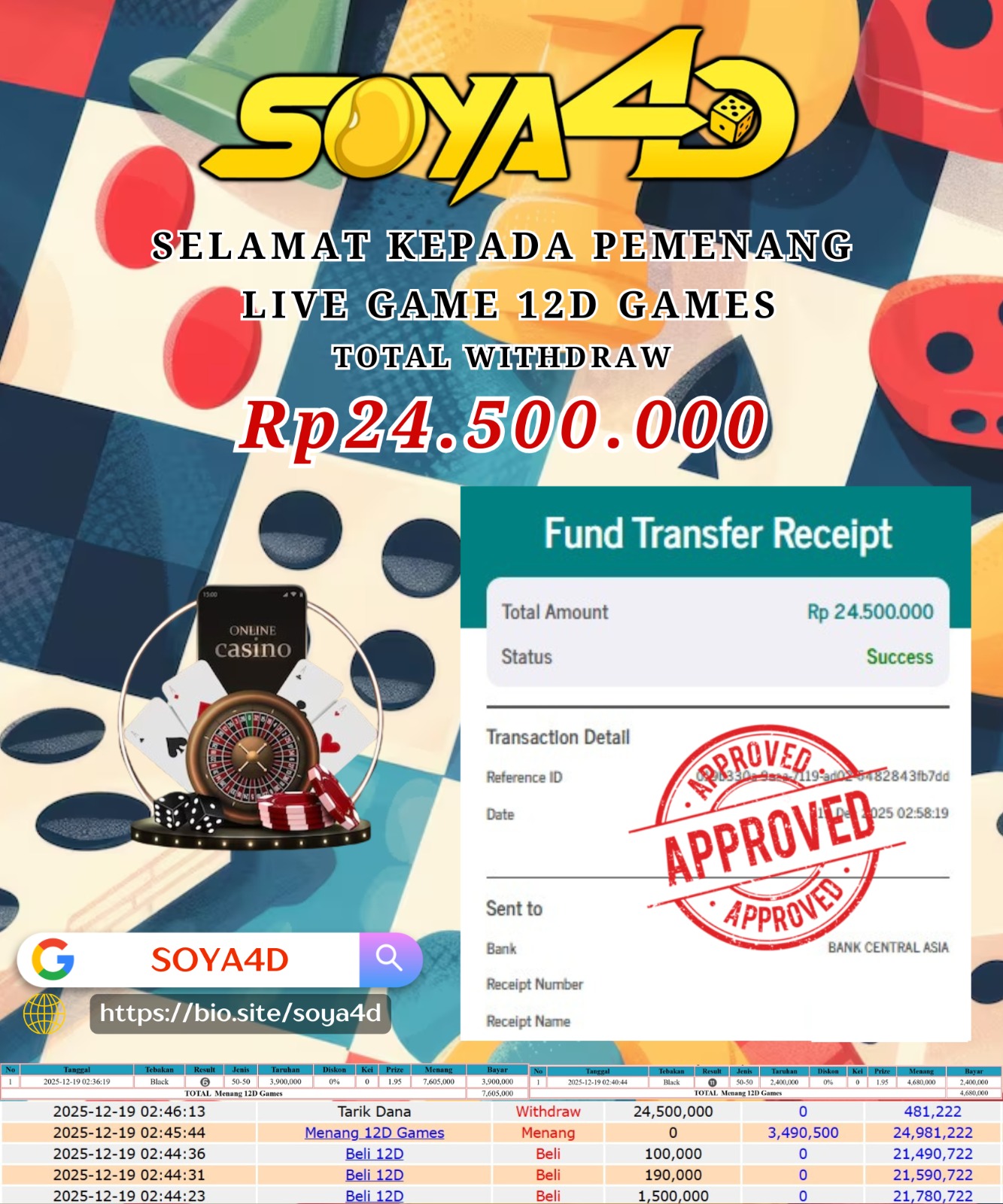Selamat kepada Userid : Ktr**** Telah berhasil mendapatkan kemenangan besar pada permainan LIVE GAME 12D GAMES . Dengan kemenangan Sebesar Rp.24.500.000.-. Setelah mengisi formulir withdraw dengan kurang waktu hanya 1 – 10 menit pihak SOYA4D sudah melakukan transfer kepada pemilik user id. Dan dana sudah masuk ke rekening id tersebut oleh pemenang. Bukti pembayaran yang kami berikan merupakan bukti pembayaran yang SAH / VALID yang langsung di dapatkan melalui tanda transfer transaksi berhasil dari Bank yang di tuju.